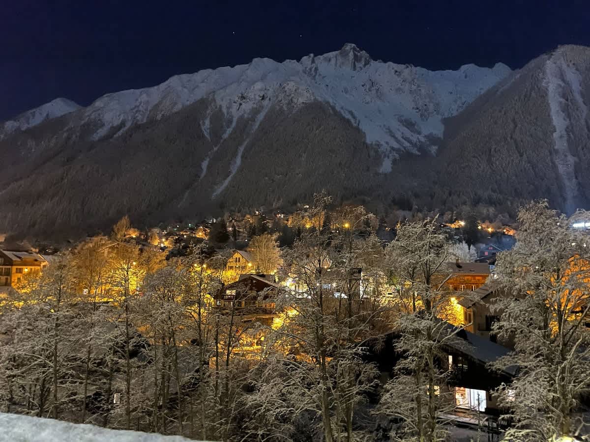 • un balcon spacieux offrant une vue panoramique sur les montagnes et la ville de Chamonix.