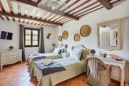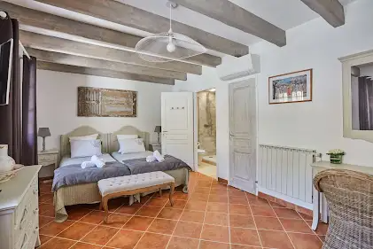 La bastide abrite cinq chambres spacieuses, chacune dotée de sa propre salle de bain privative et d’une télévision. La disposition des espaces a été pensée pour préserver l’intimité et le confort de chacun, tout en maintenant une atmosphère accueillante et harmonieuse.