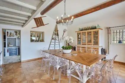 Les pièces à vivre s’ouvrent largement sur l’extérieur, baignant la maison de lumière et favorisant la convivialité. Le décor intérieur, sobre et raffiné, met en valeur des matériaux nobles qui soulignent l’authenticité et le caractère de la bastide. Une connexion Wi-Fi en fibre optique couvre l’ensemble du domaine, et une petite salle de sport permet à ceux qui le souhaitent de rester actifs durant leur séjour.