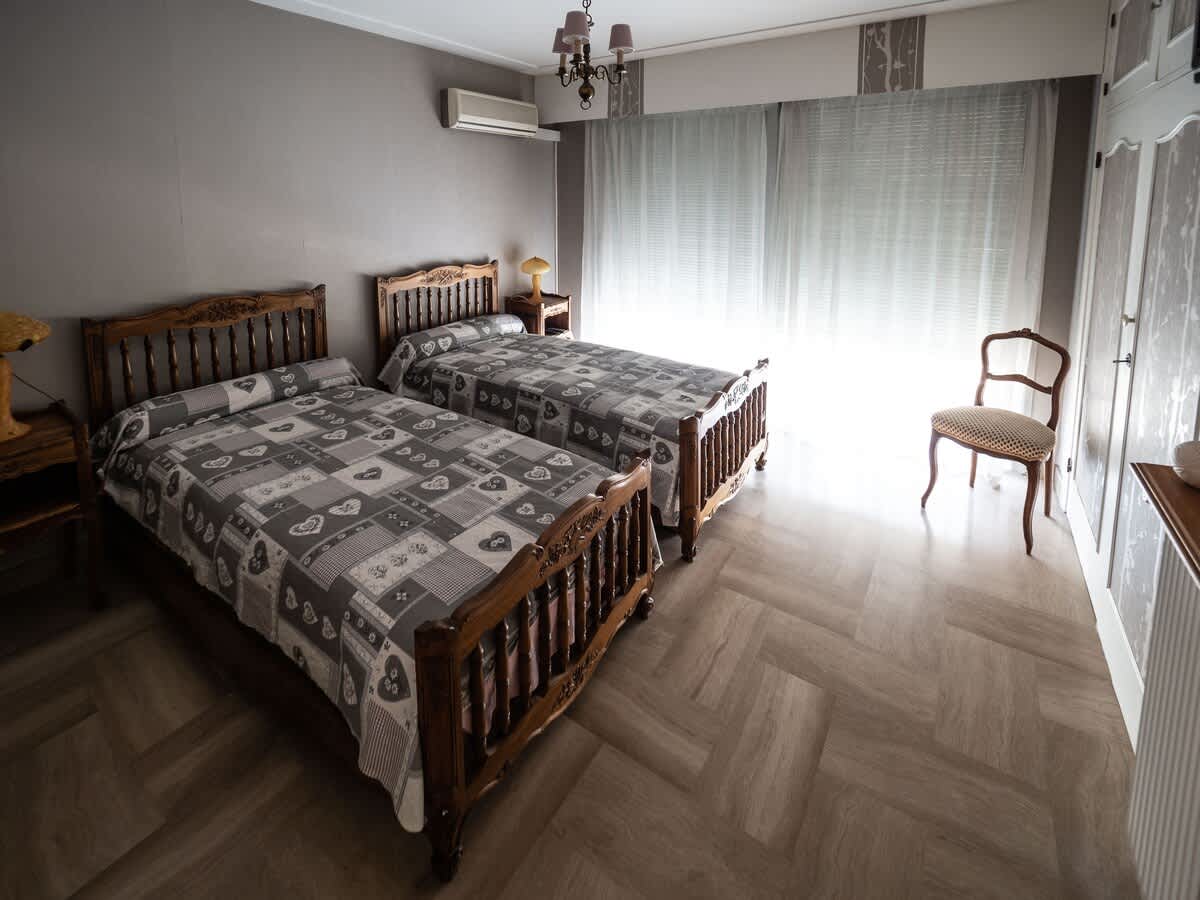 - Chambre 2 : Deux lits simples, grand placard, fauteuil et salle de bains rénovée avec baignoire, lavabo et grand miroir.