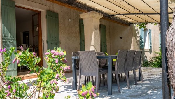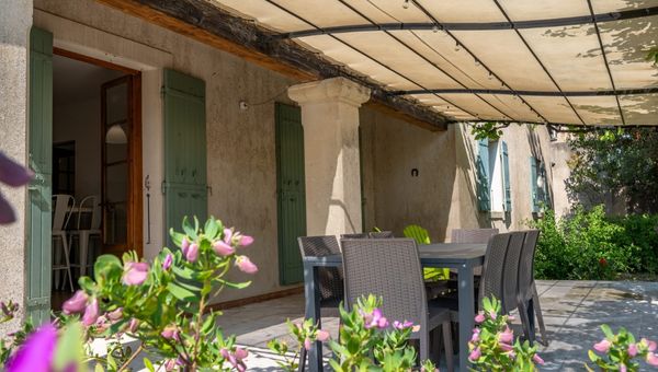 Grande terrasse ombragée avec table et chaises pour des repas en extérieur.