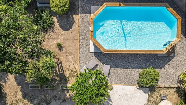 Piscine hors-sol sécurisée (7x4 m, profondeur 1,40 m).