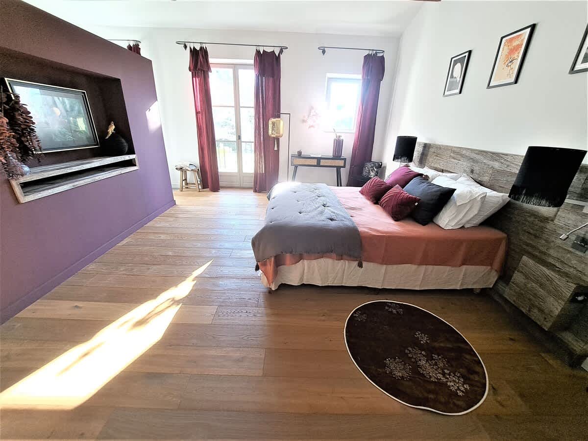 Chambre 4 : « suite Asia » avec lit double (160 x 200 cm), dressing et salle de bain attenante avec baignoire, douche, double vasque et WC.