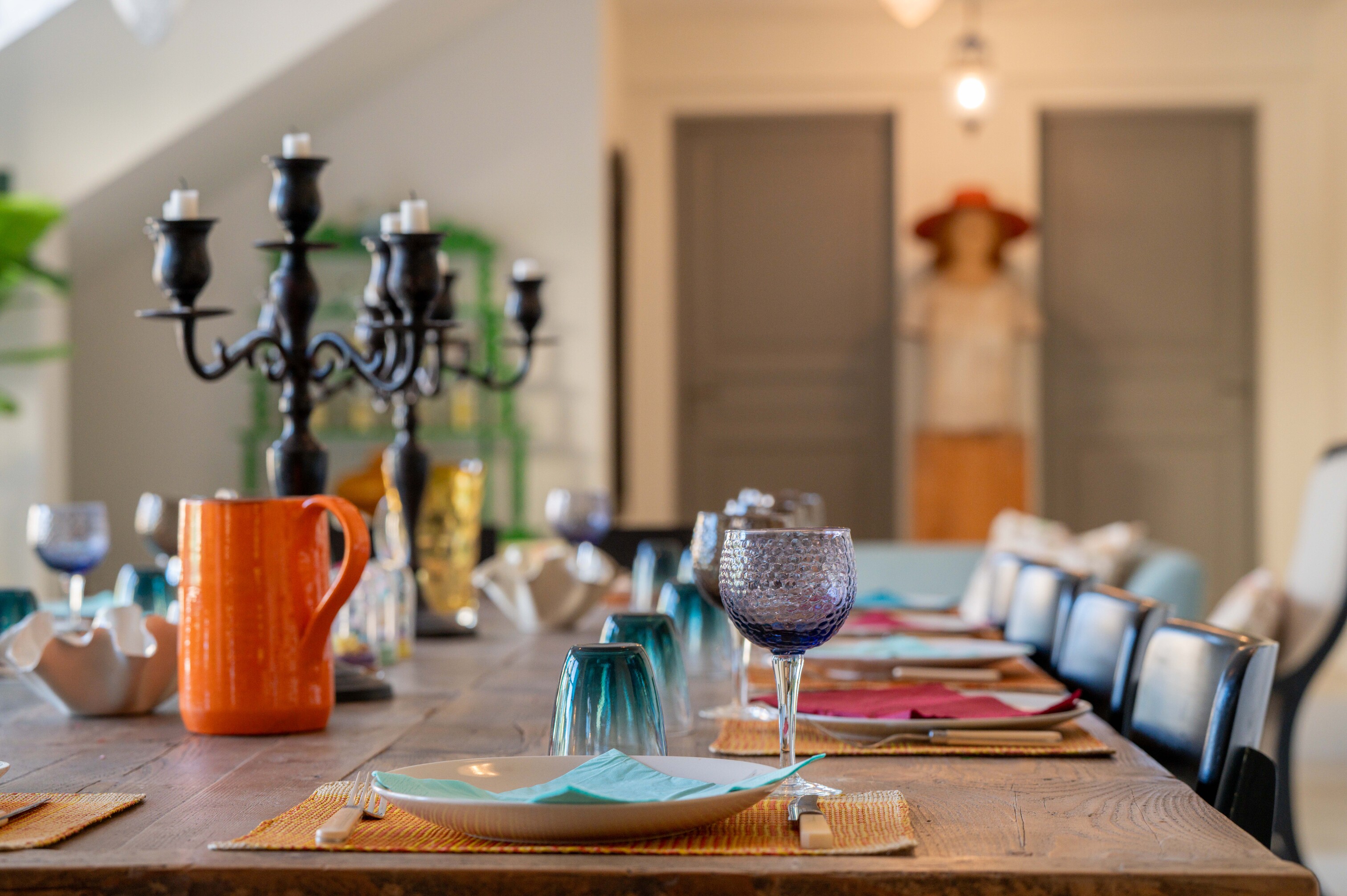 Dès l’entrée, une atmosphère singulière se dégage, avec le sentiment de découvrir un petit village dans le village, et une cour particulièrement agréable pour les apéritifs et dîners au coucher du soleil.