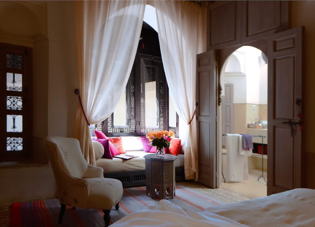 La chambre 6 est imprégnée par la présence d’un rare meuble à caissons du 19ème siècle provenant d’une école coranique. Elle est également décorée de souvenirs ramenés d’un voyage à Djenné, au Mali, qui illustrent les liens qui existent entre le Maghreb et le Sahel.