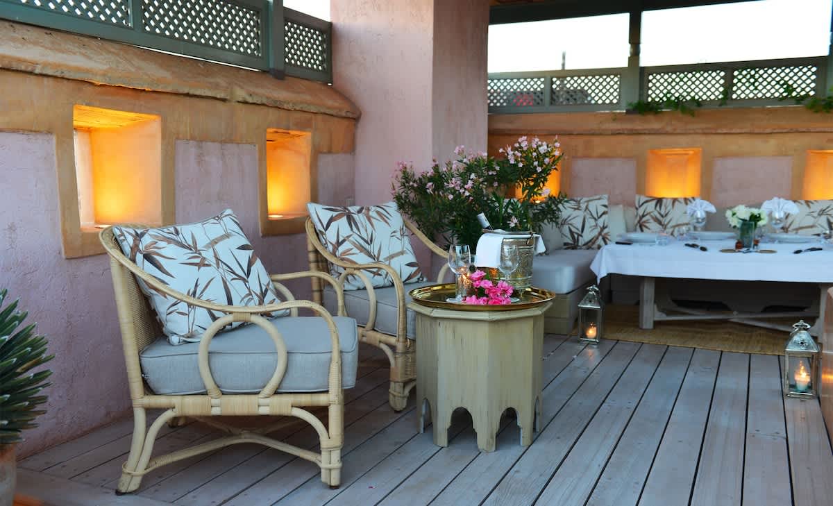 Les terrasses sont un lieu mythique propre au délassement. Les salons, sous la pergola ou près des bougainvilliers, vous permettent de tout oublier tout en écoutant, en sourdine, les bruits de la médina et l’appel du muezzin à l’heure de la prière. Vous choisirez de prendre l’apéritif sous les étoiles ou un dîner aux chandelles entre amis ou en tête-à-tête.