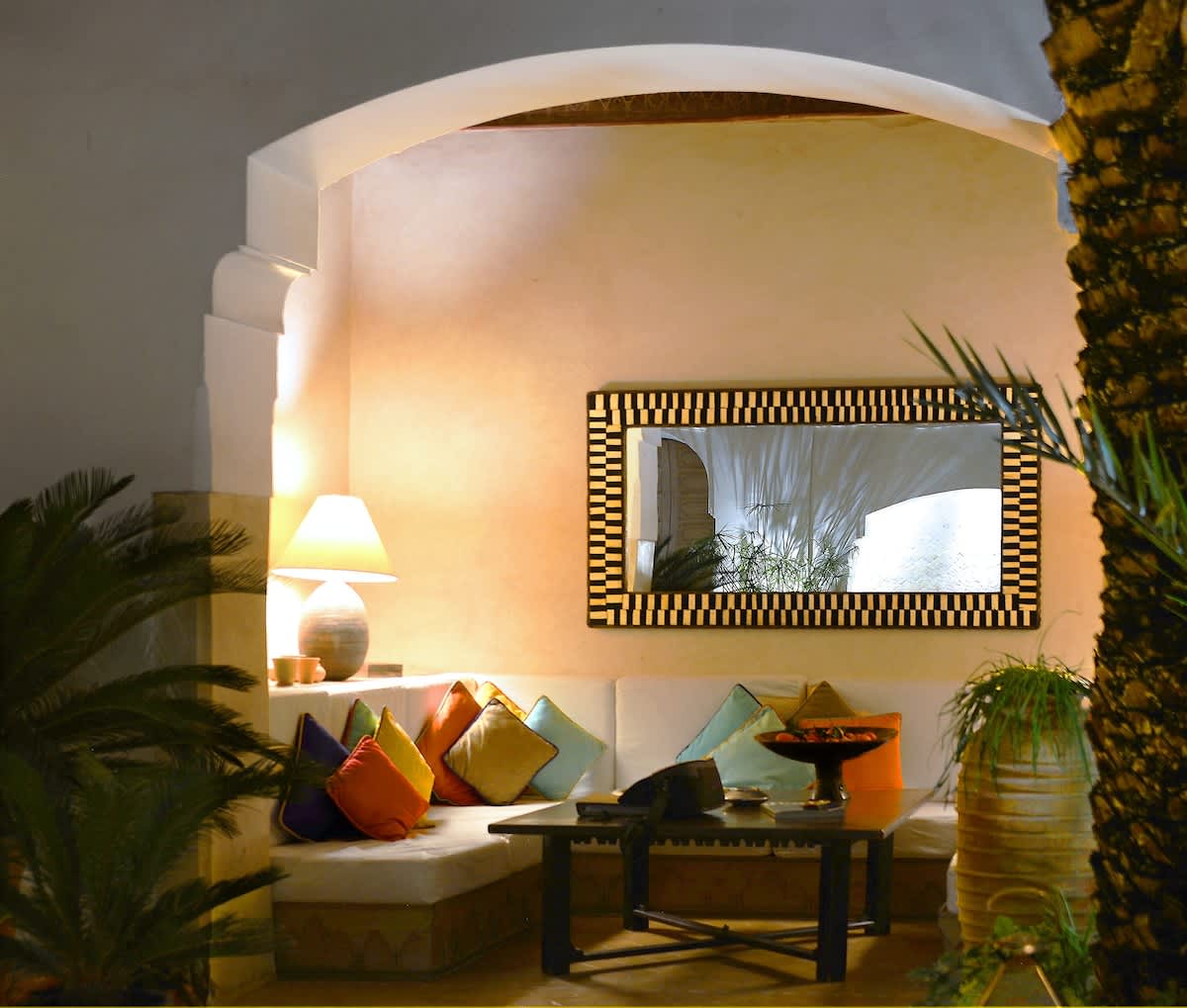 Le salon, la salle à manger et les 6 suites convergent toutes vers le patio planté de palmiers au centre du riad. Il offre la tranquilité d’un bassin fontaine ou vous pourrez vous rafraîchir aux heures les plus chaudes de la journée. Protégé du soleil, le patio permet d’y siroter un thé à la menthe ou d’y dîner à la lumière des lanternes. Le patio est équipé d’un système de brumisation pour les heures chaudes en été, vous pourrez apprécier cette agréable fraicheur.