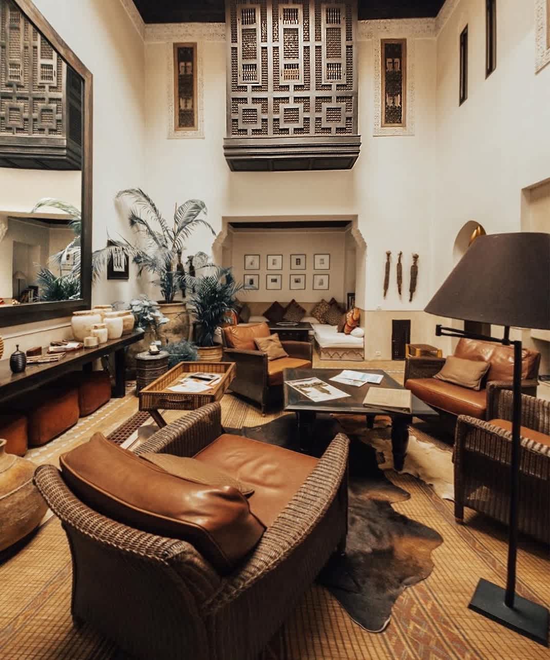 Le grand salon, à l’ambiance feutrée et coloniale, est ouvert en été sur le ciel par une douaya. En hiver, il devient un lieu très intime grâce à son feu ouvert. La terrasse privée offre une vue superbe sur la Koutoubia et l’Atlas. Une toile et un “menzeh” permettent d’y passer d’agréables moments de repos et de dîner à la lumière des bougies.