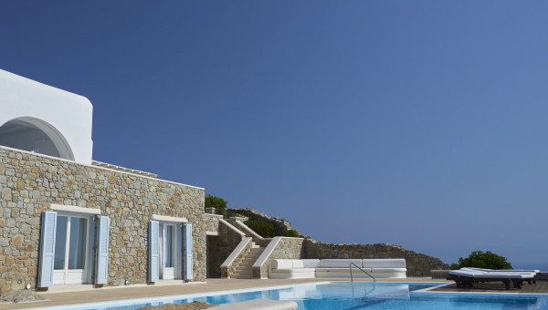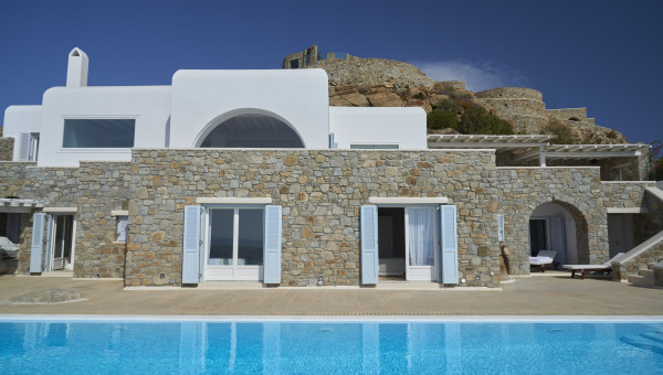 La Villa Ambrosia située dans un cadre unique à Mykonos, en Grèce, s’élève avec élégance, sa façade blanchie à la chaux et ses volets bleu pastel évoquant l’authenticité des cafés côtiers de Psarou.