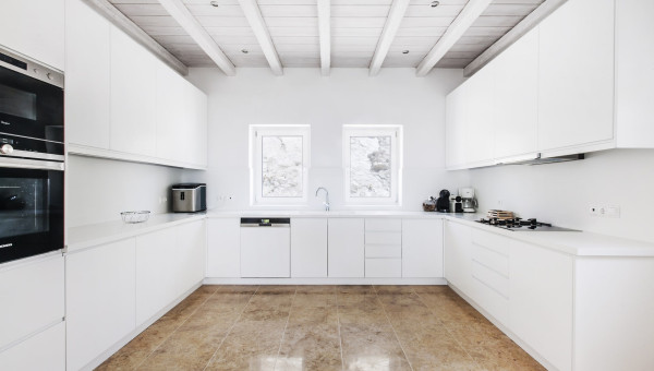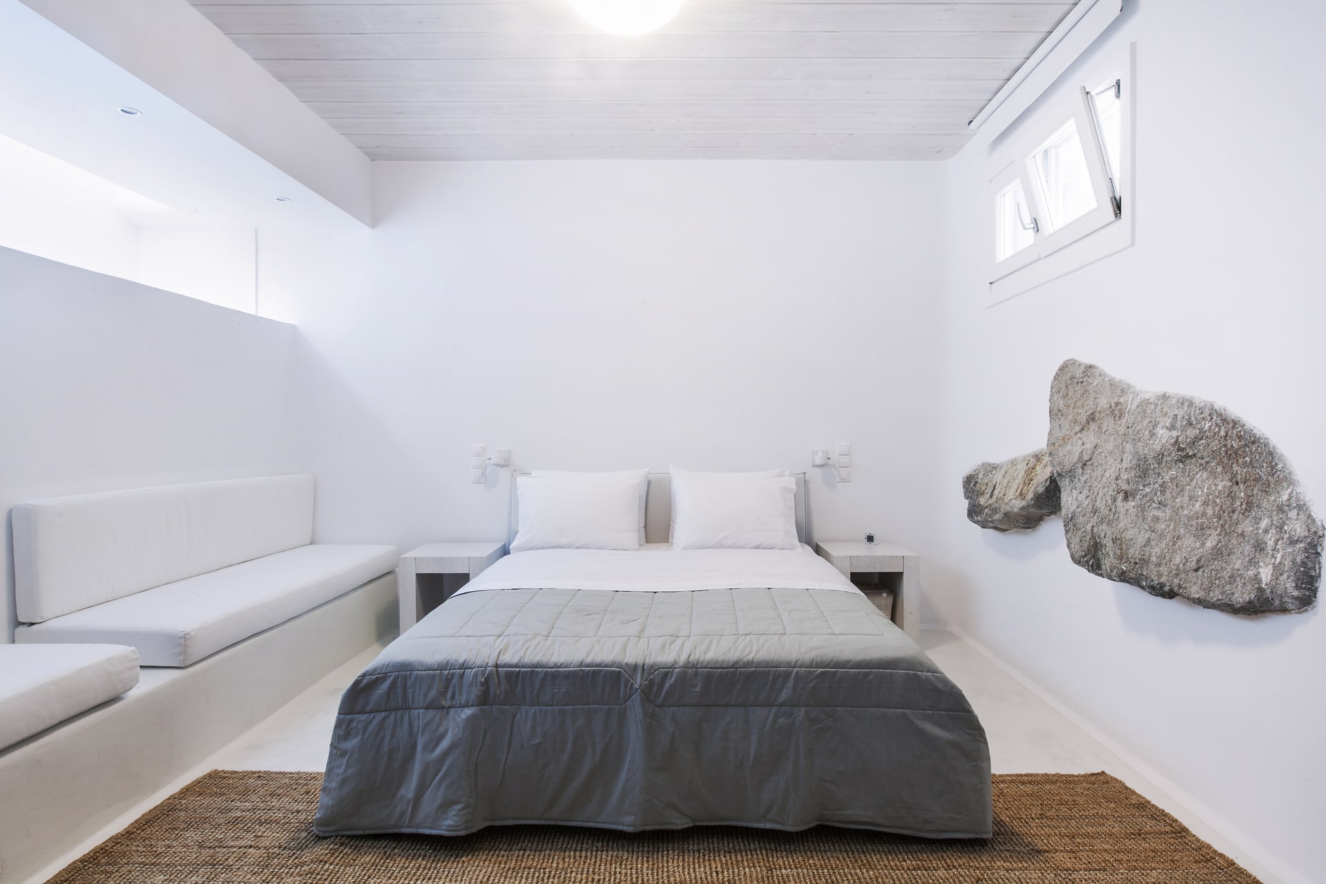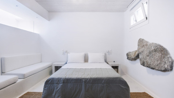 À l’intérieur, une décoration minimaliste en monochrome de blanc, rehaussée par des sols couleur sable et des tapis tissés, crée une ambiance chaleureuse et épurée. Les chambres, agrémentées de murs immaculés ponctués de vieilles pierres, s’illuminent le soir grâce à des plafonds en bois éclairés par des LED, mettant en valeur des œuvres d’art contemporain.