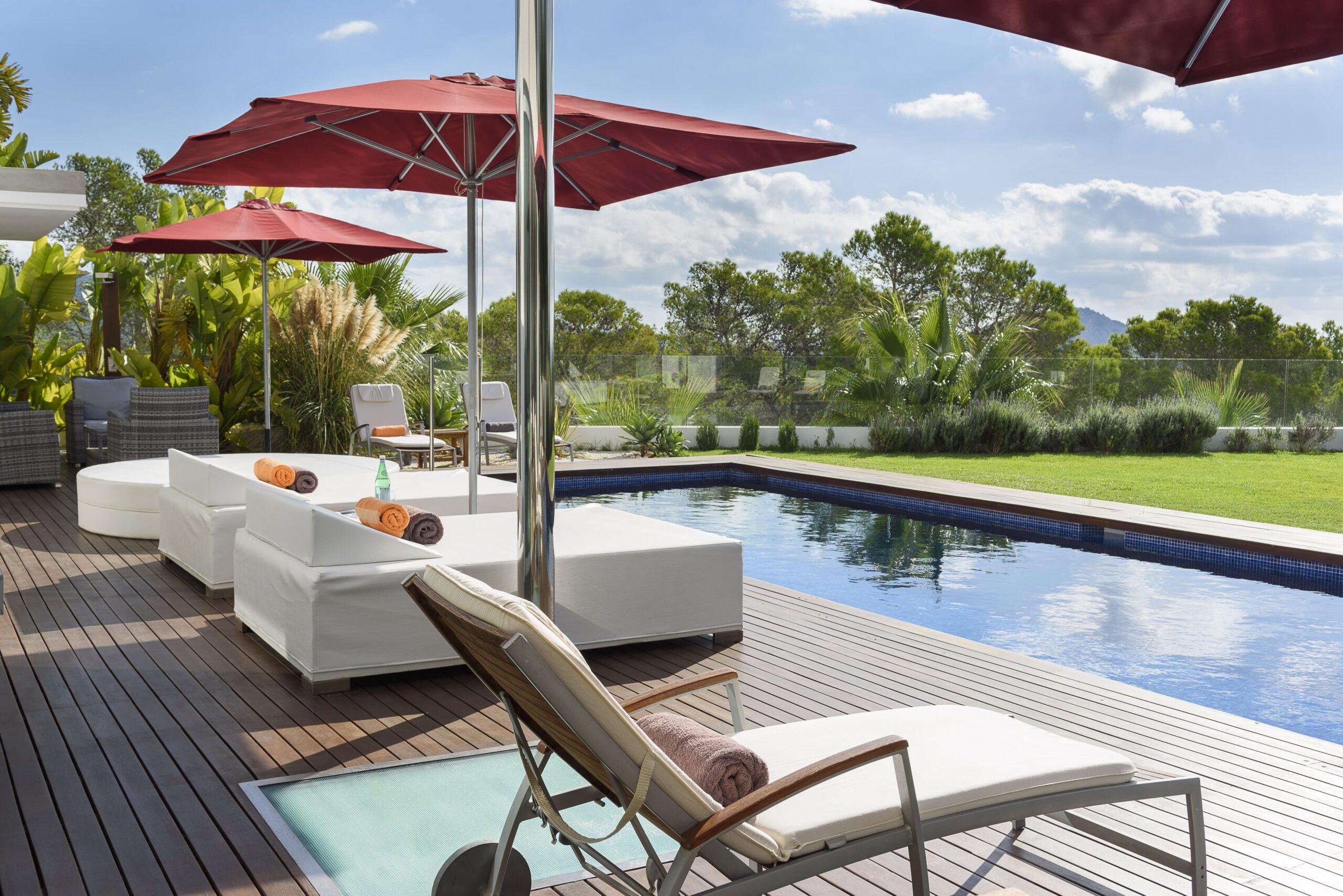 L’extérieur est un véritable plaisir pour les sens : la terrasse avec vue imprenable, la piscine scintillante, les transats élégants et les espaces de repas en plein air créent un cadre idyllique pour savourer les couchers de soleil flamboyants sur la mer Méditerranée.