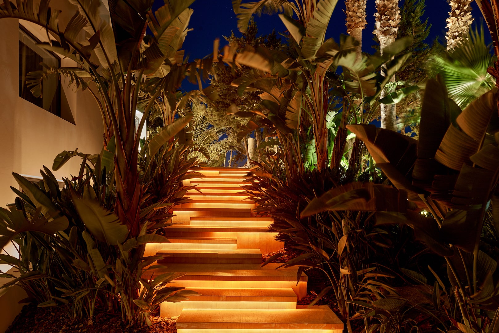 Chaque élément de décoration, inspiré de la nature environnante, célèbre la beauté d’Ibiza : accents bleu marine évoquant la mer, orchidées fuchsia apportant une touche de vitalité, et palmiers d’intérieur instaurant un lien subtil entre intérieur et extérieur.