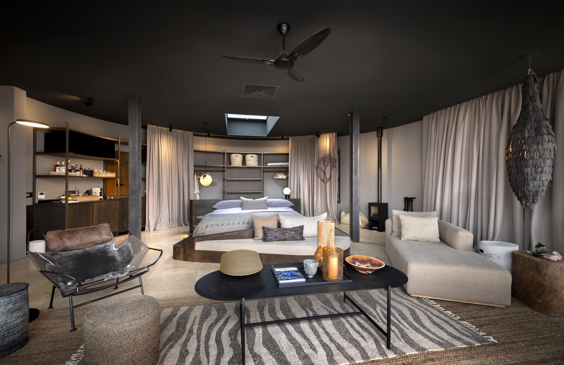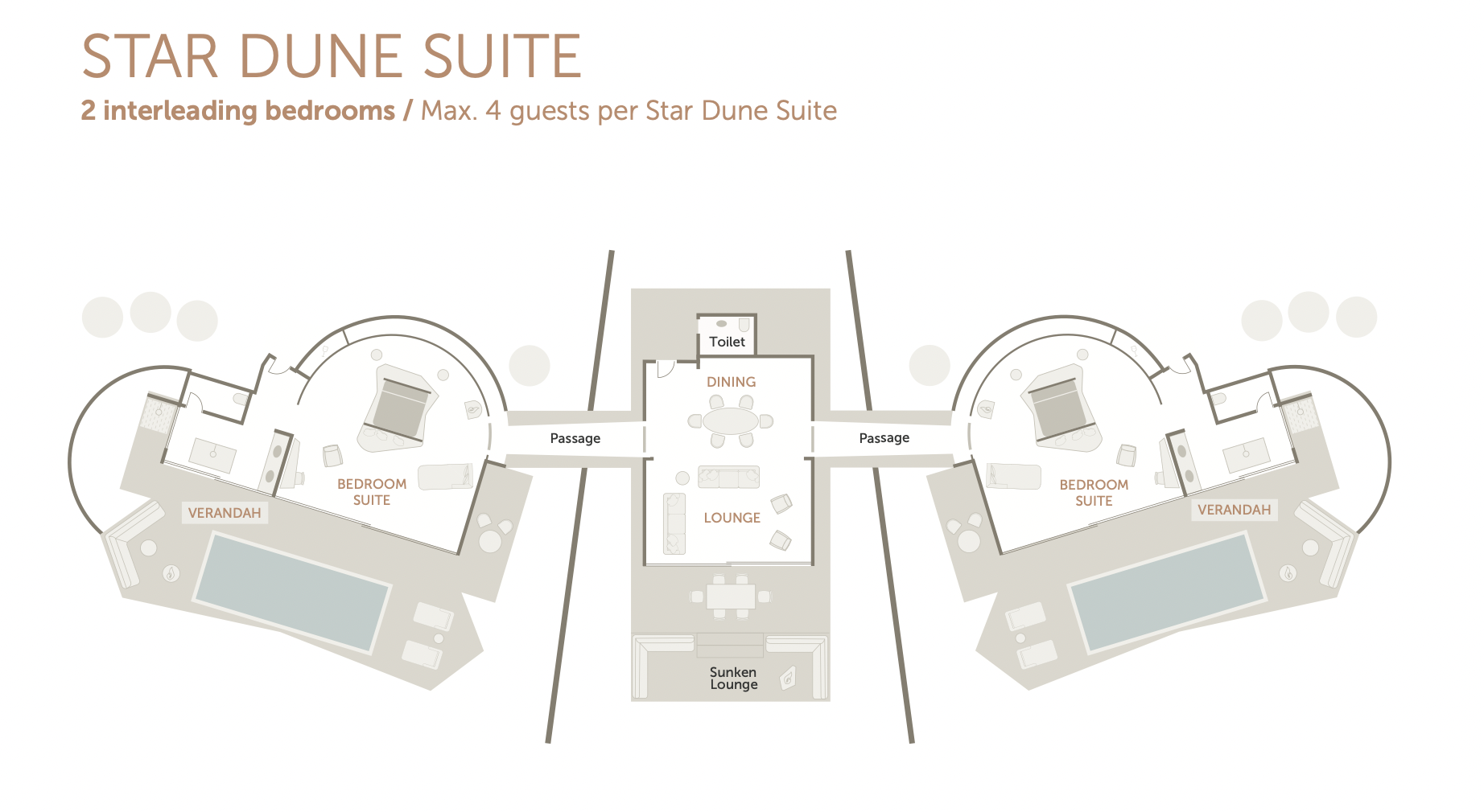 Quant à notre suite « Star Dune », elle se compose de trois blocs. Deux d’entre eux abritent des chambres épurées, tandis que le troisième bloc est un espace commun avec un salon aménagé, une terrasse avec des canapés et une cheminée. Chaque chambre possède sa propre salle de bain et sa terrasse privée avec piscine à débordement.