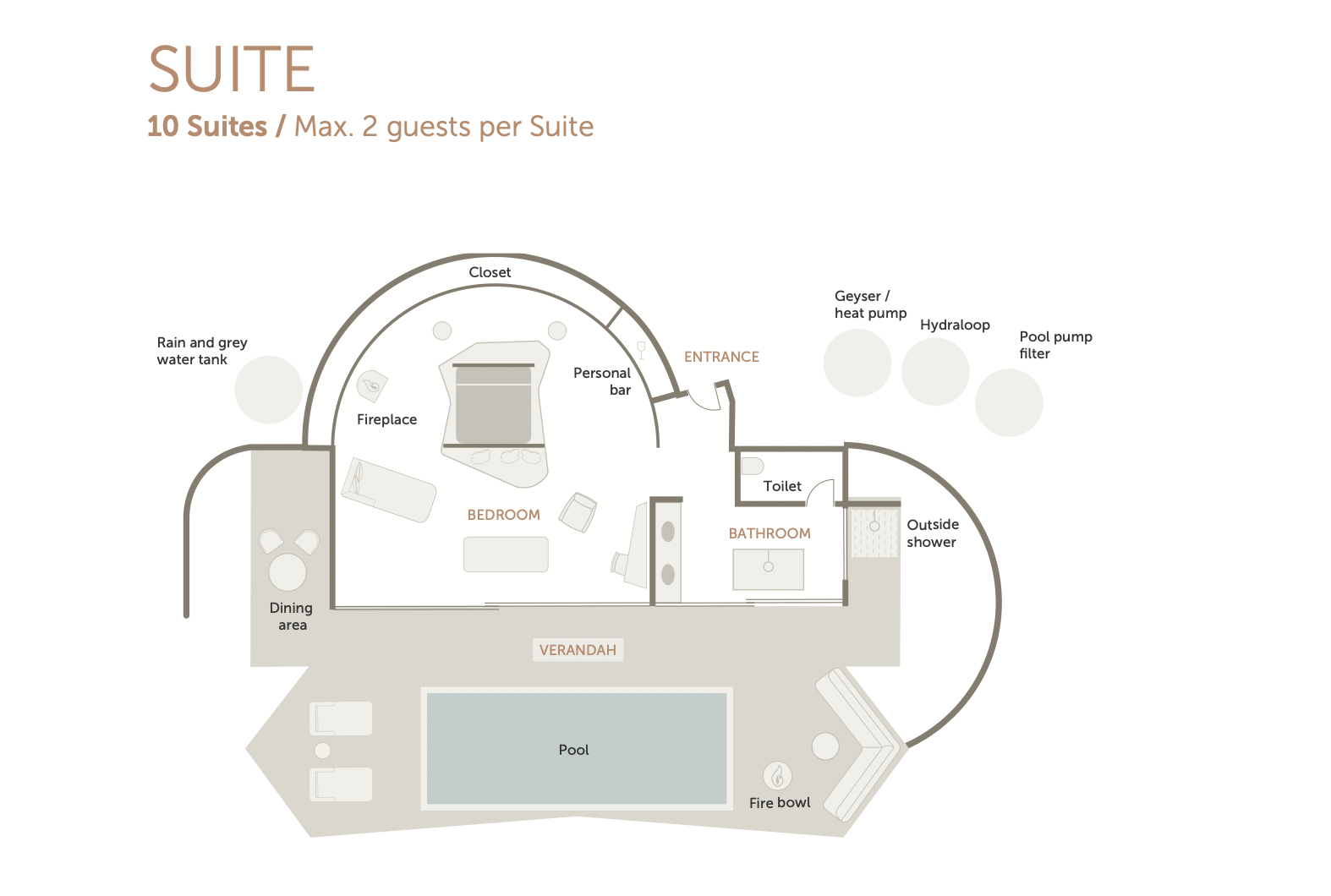 Nos chambres doubles, appelées « Dune », sont composées d’une grande pièce circulaire faisant office de chambre et de salon. Elles s’ouvrent sur une salle de bain avec douche extérieure et une terrasse dotée d’une piscine à débordement s’étendant sur toute la longueur de la chambre et de la salle de bain.