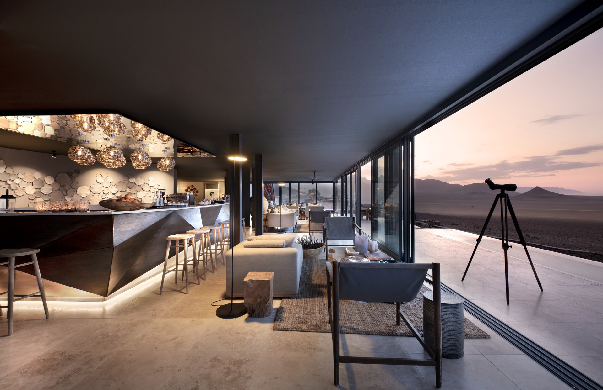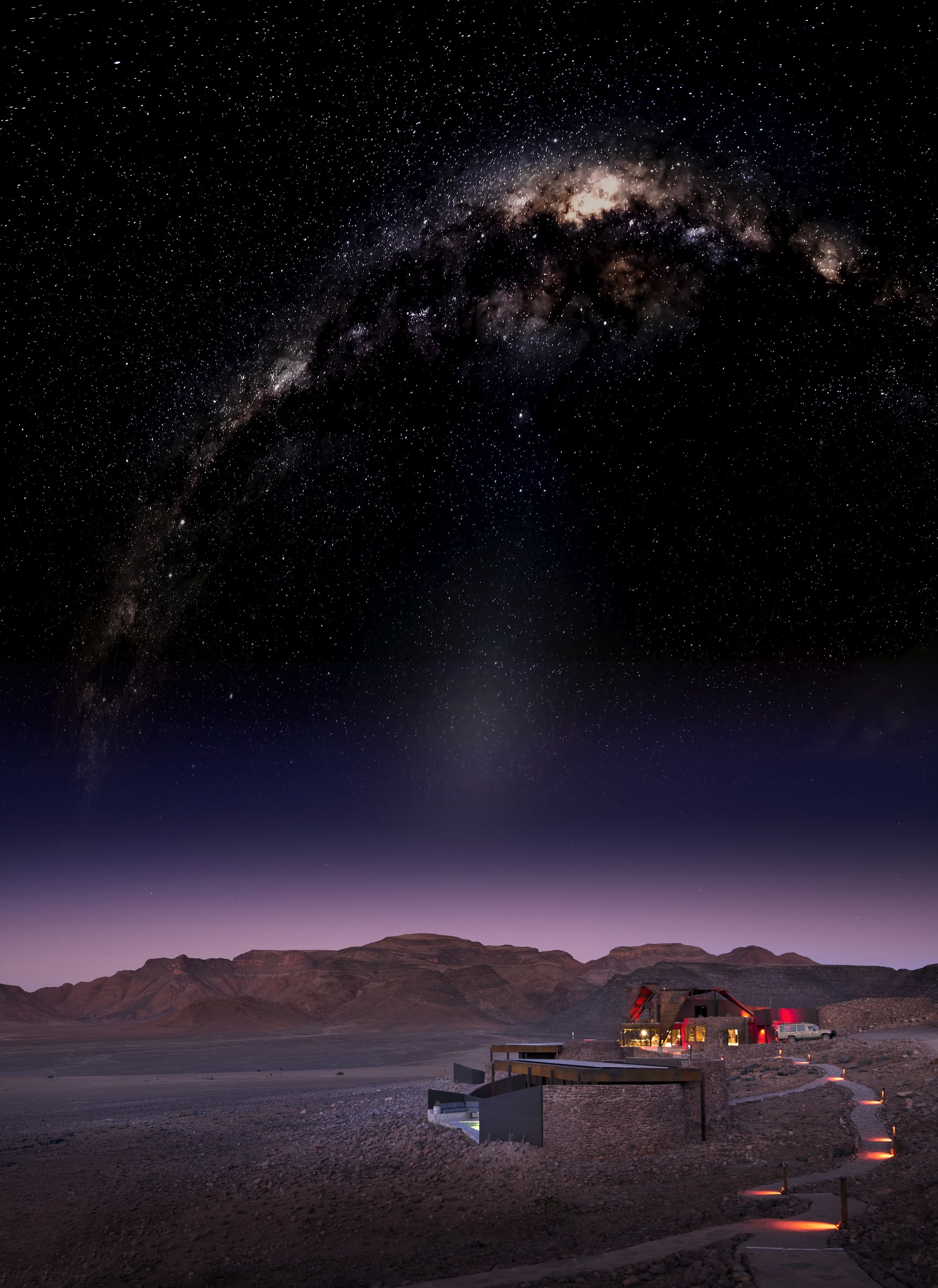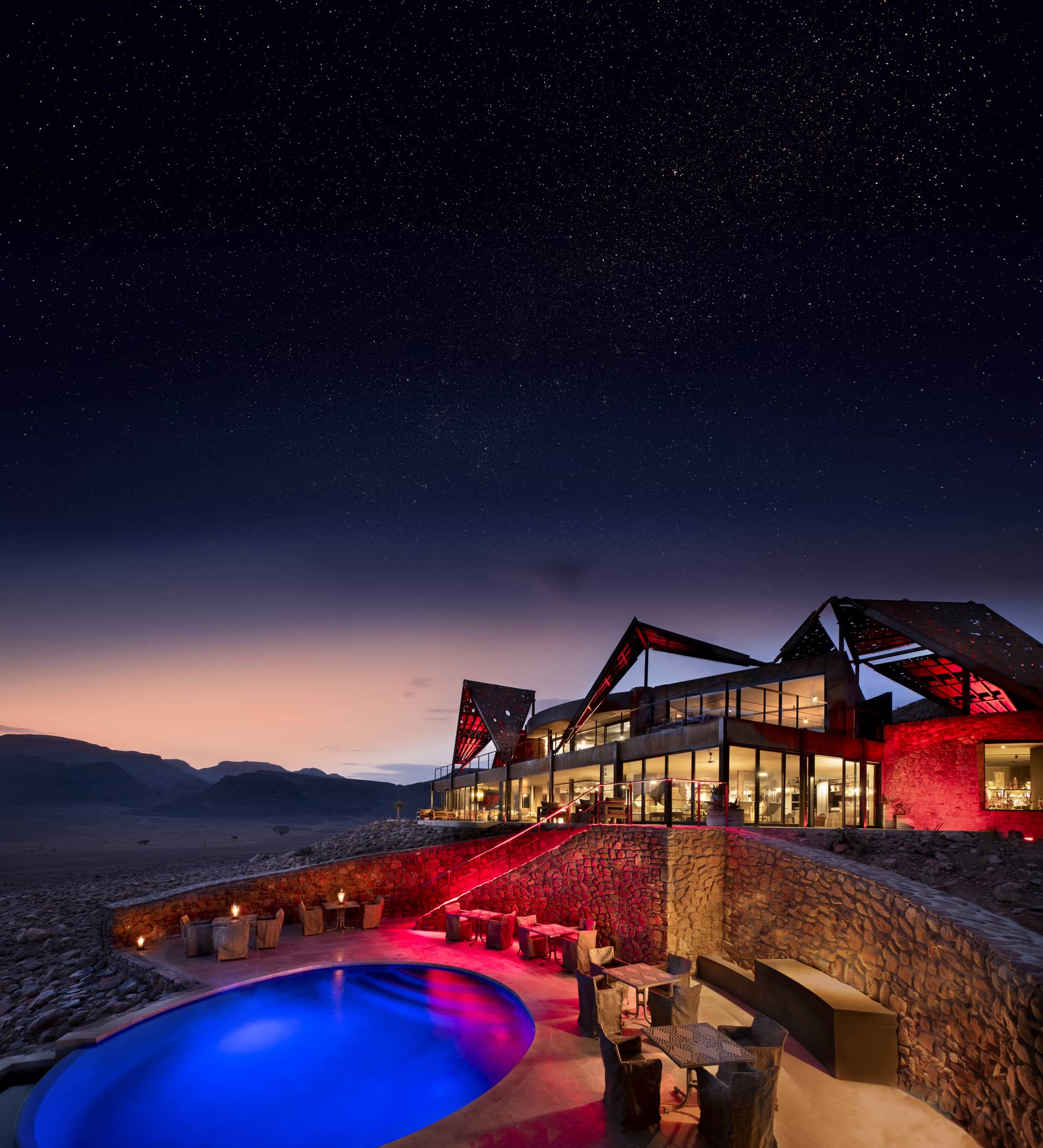 Alors n’attendez plus pour réserver votre séjour de luxe en Namibie. Notre Ecolodge est situé au cœur de sa propre réserve privée de 35 000 hectares, au sein du plus ancien désert de la planète. Adossé à une montagne et ouvert sur une infinie plaine rocheuse, notre lodge adopte une architecture moderne avec des matériaux tels que l’acier, le béton ciré et de larges baies vitrées qui s’intègrent parfaitement à l’environnement naturel.