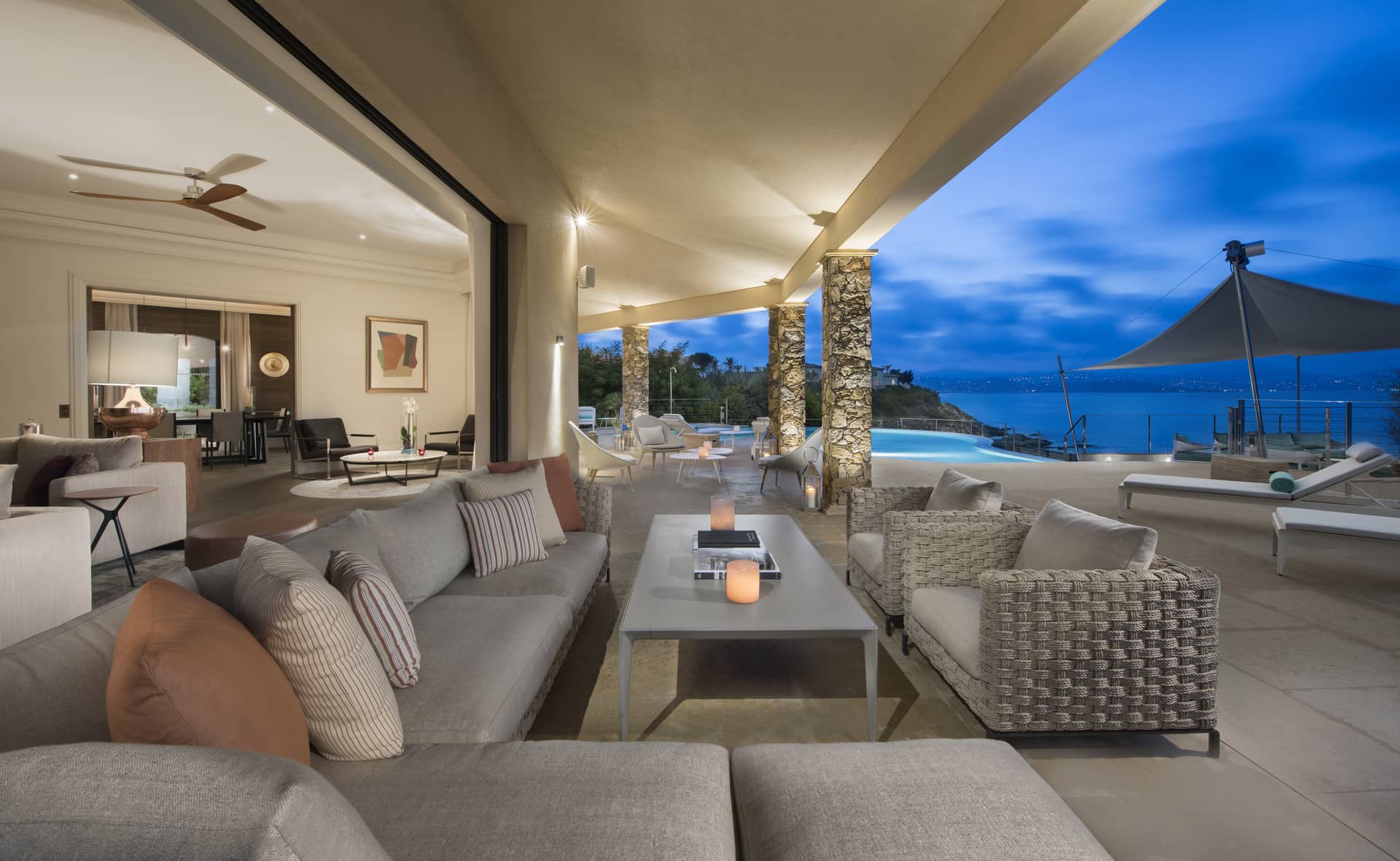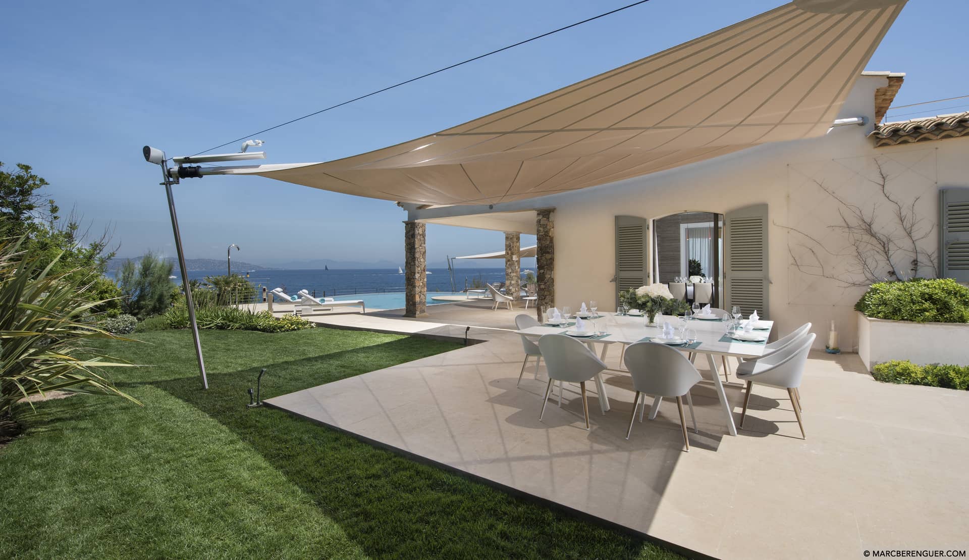 La villa offre une vue imprenable sur la mer, que l’on savoure depuis le salon, la terrasse ou même la piscine. Sa grande table extérieure pouvant accueillir jusqu’à 21 convives promet de beaux moments de partage, autour d’un barbecue ou d’une plancha au coucher du soleil.