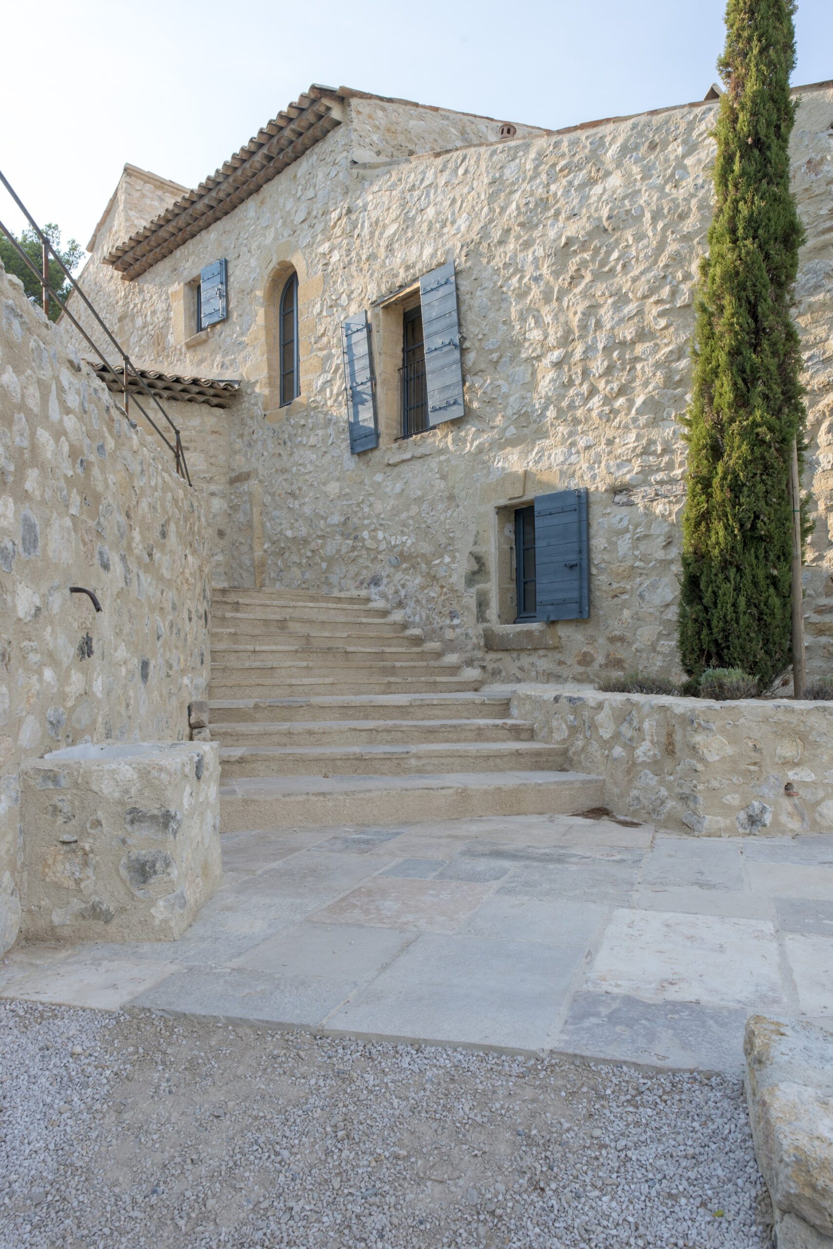 La Villa Cigale dispose d’une façade en pierres couleur sable se pare de volets en bois au bleu glacier raffiné, créant une esthétique harmonieuse.