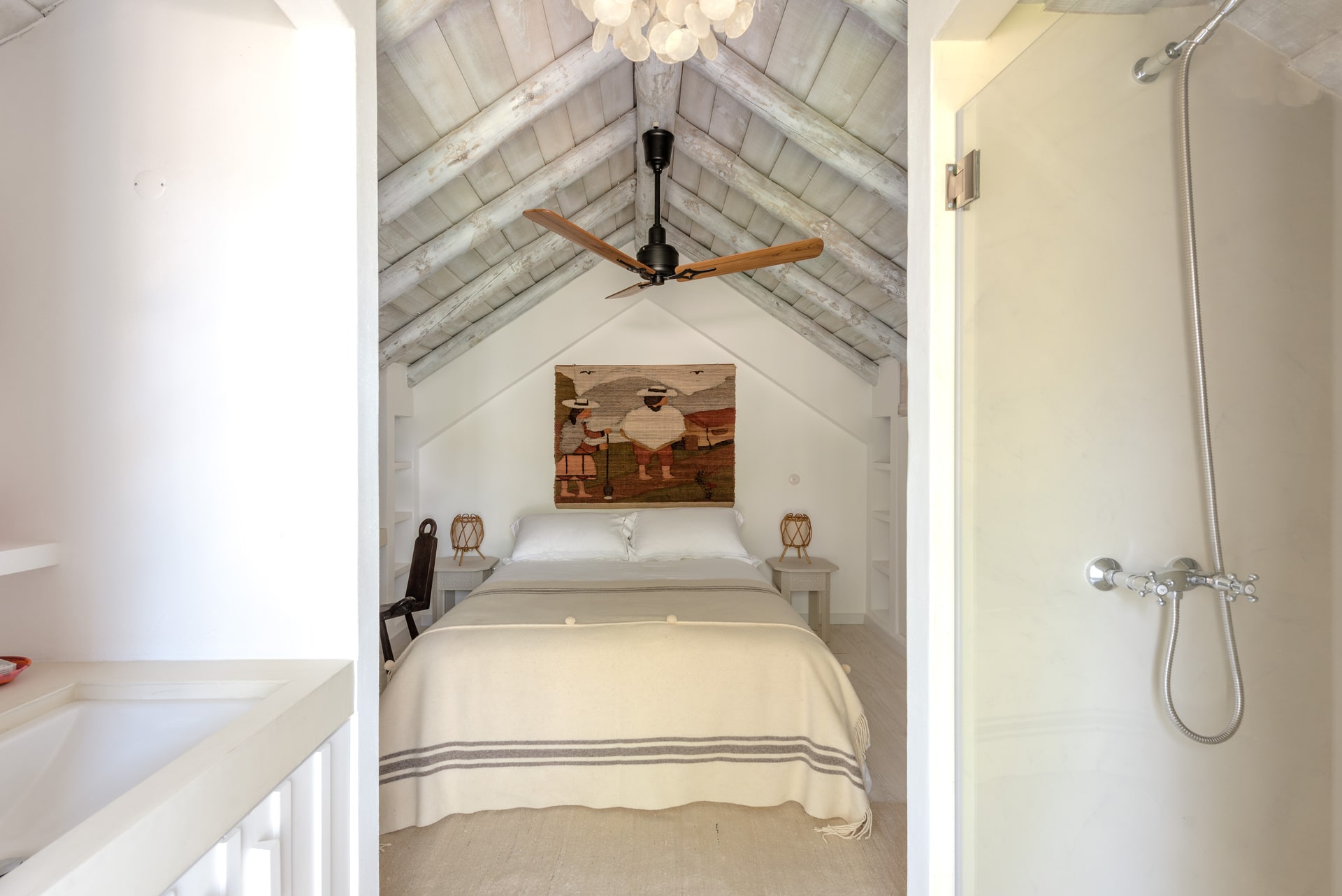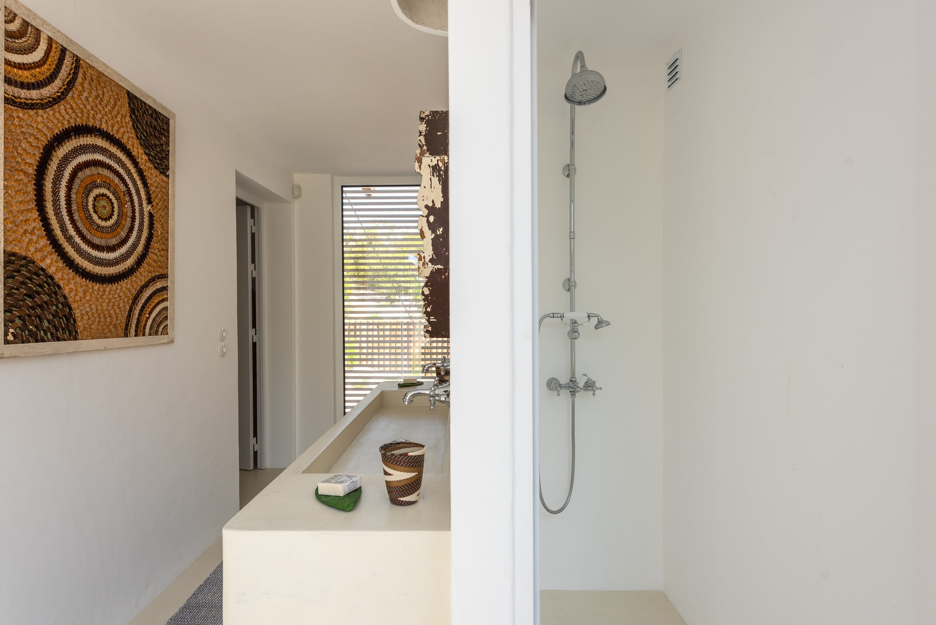 Le salon spacieux et lumineux est l’endroit idéal pour se détendre en famille ou entre amis, tandis que la cuisine entièrement équipée ravira les passionnés de gastronomie désireux de préparer des repas mémorables. La fresque colorée dans la salle à manger ajoute une touche artistique et locale à l’espace, créant ainsi une ambiance chaleureuse et accueillante.