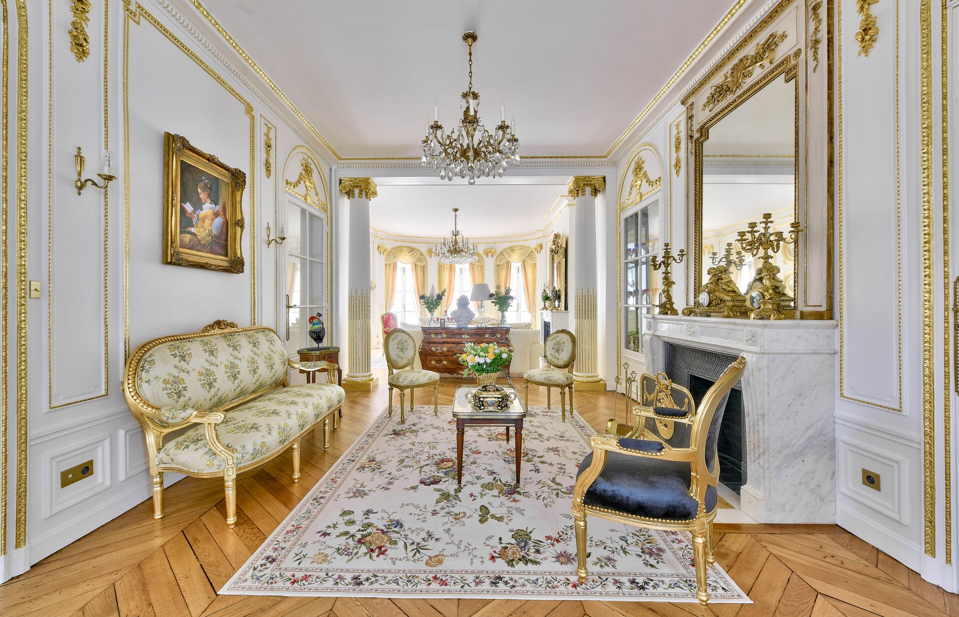Chaque détail de notre espace a été soigneusement pensé pour offrir une immersion authentique dans l’histoire et la culture parisiennes. Des miroirs dorés somptueux, des meubles anciens aux lustres étincelants, en passant par les œuvres d’art et les moulures faites à la main, chaque élément contribue à créer une atmosphère unique.