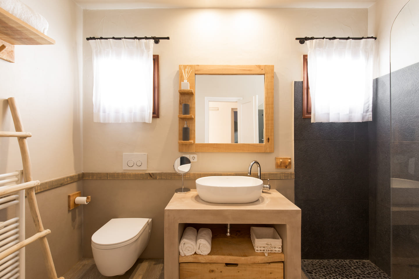 Les 6 chambres luxueuses et leurs salles de bain privatives garantissent à chaque invité un confort absolu. Dès l’entrée, on est séduit par la décoration inspirée de la nature : bois flotté, galets blancs, osier et teintes claires se mêlent pour créer une ambiance douce et lumineuse.