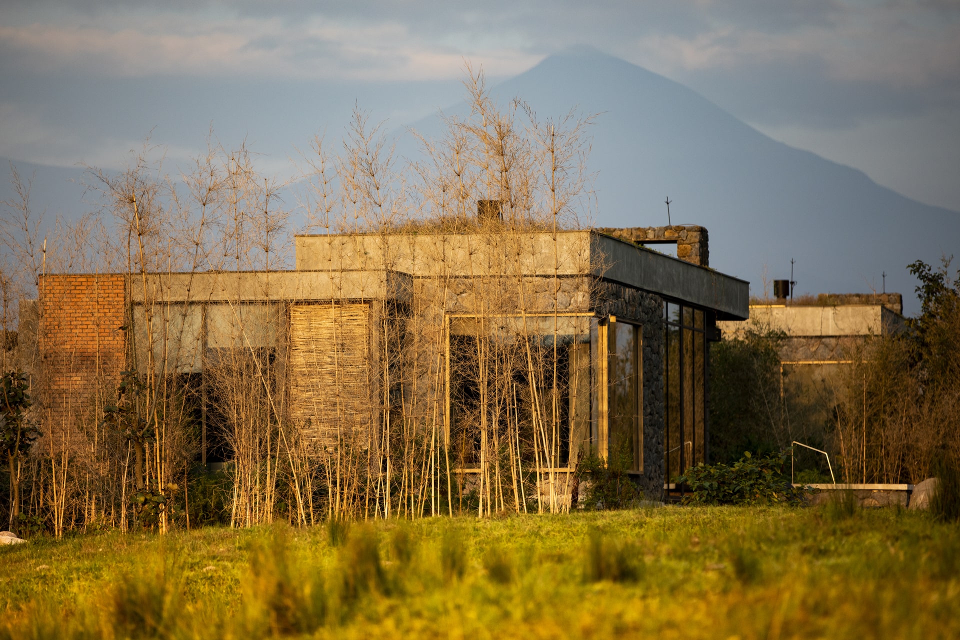 Entourée de bambous de montagne, de fougères, de lobelias géants et d’arbres forestiers, la villa s’intègre harmonieusement à la nature environnante, créant une atmosphère magique où les bâtiments semblent se fondre dans la forêt au fil du temps. Les structures organiques aux allures de cabanes, avec leurs toits verts, murs en pierre et vérandas lumineuses, créent un jeu fascinant de formes et de textures.