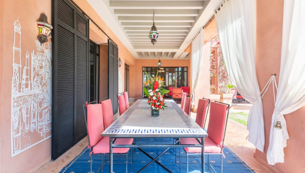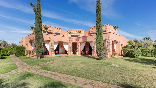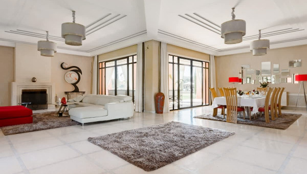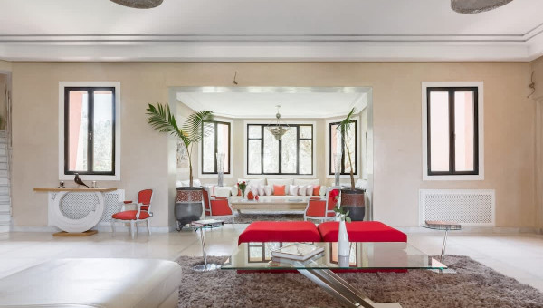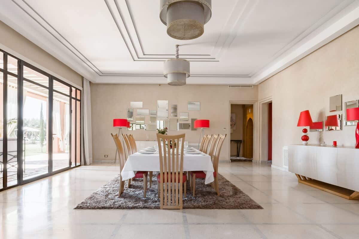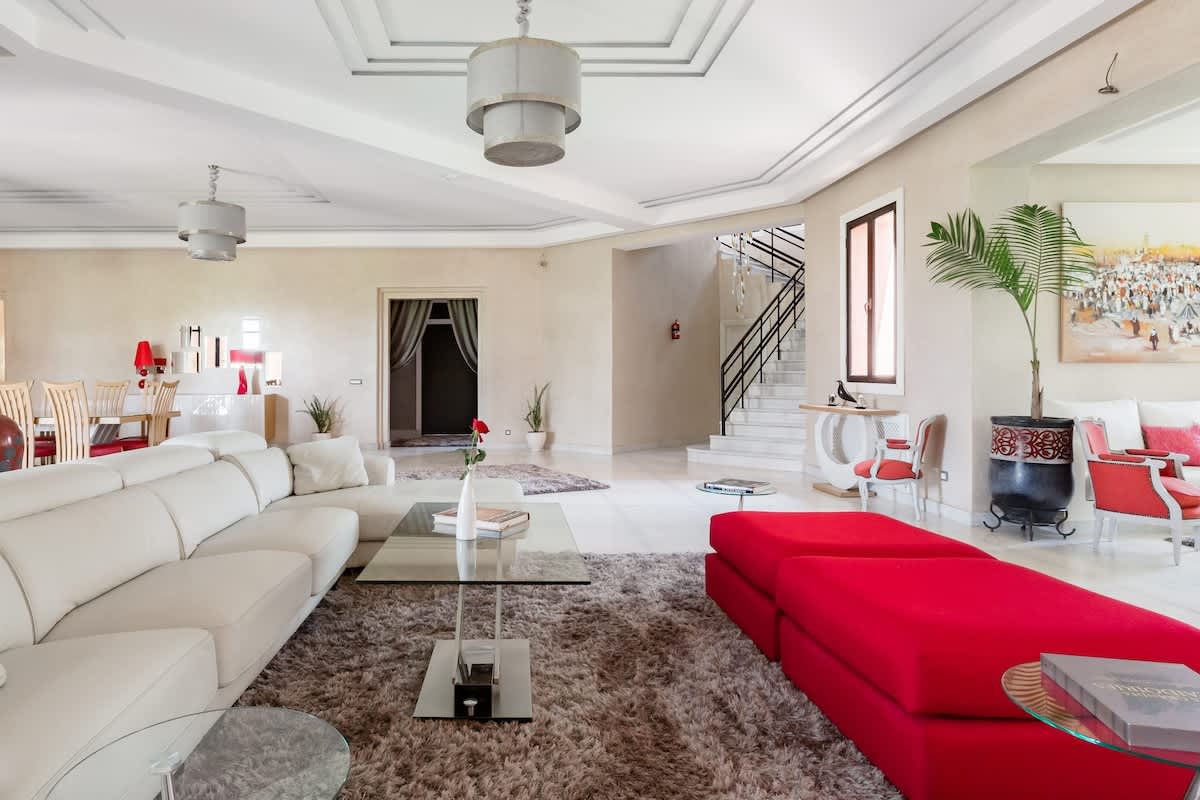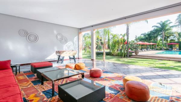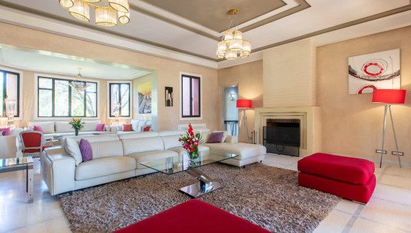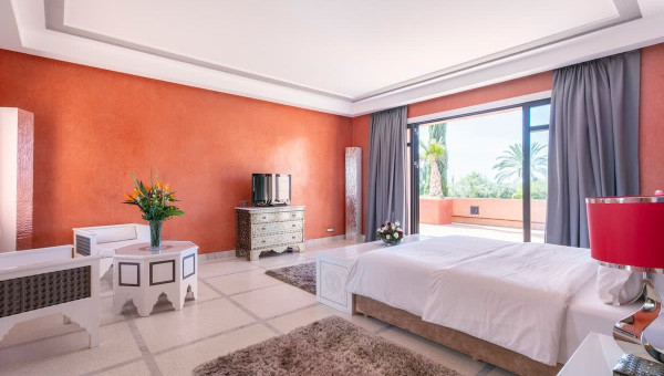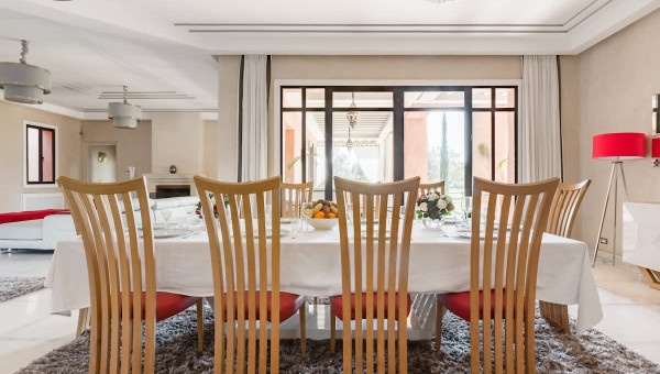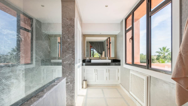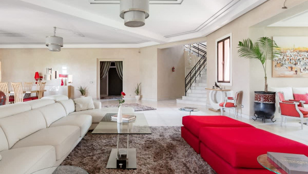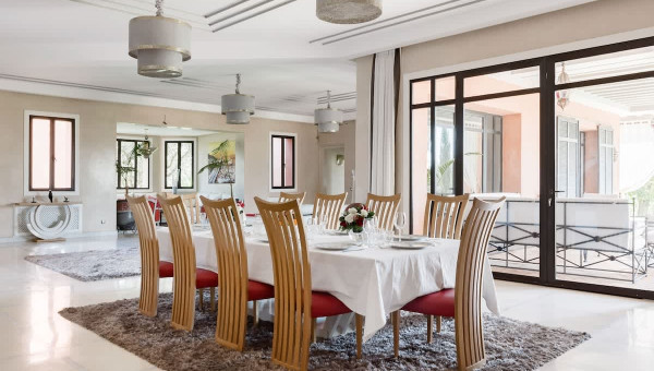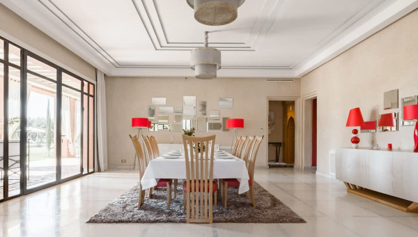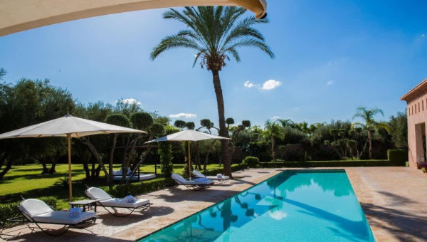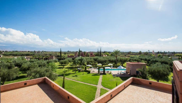 Détendez vous sur la terrasse avec une vue magnifique sur l'Atlas. Spacieuse, avec sa salle à manger, ses deux salons baignés de lumière, ses 5 suites avec salles de bains et vue sur le jardin avec sa piscine de 18m.