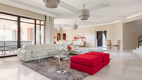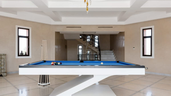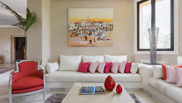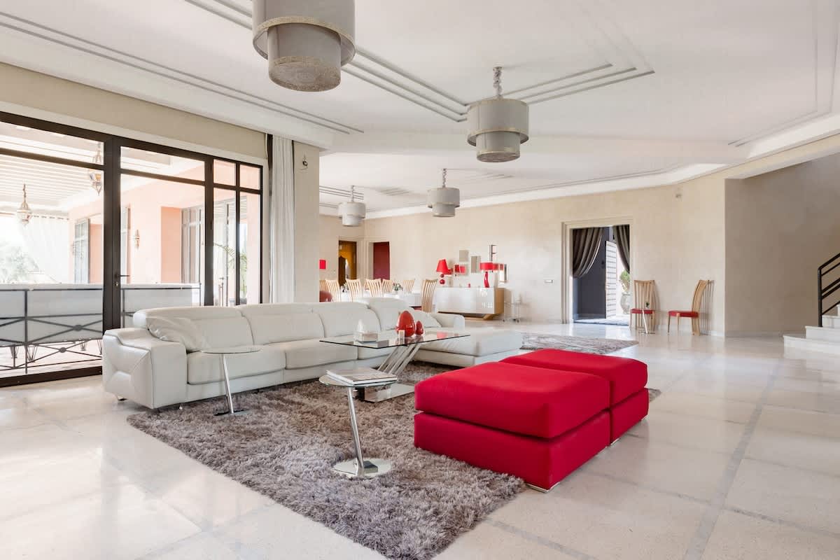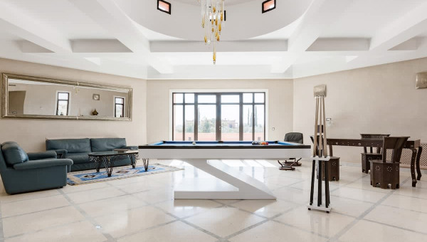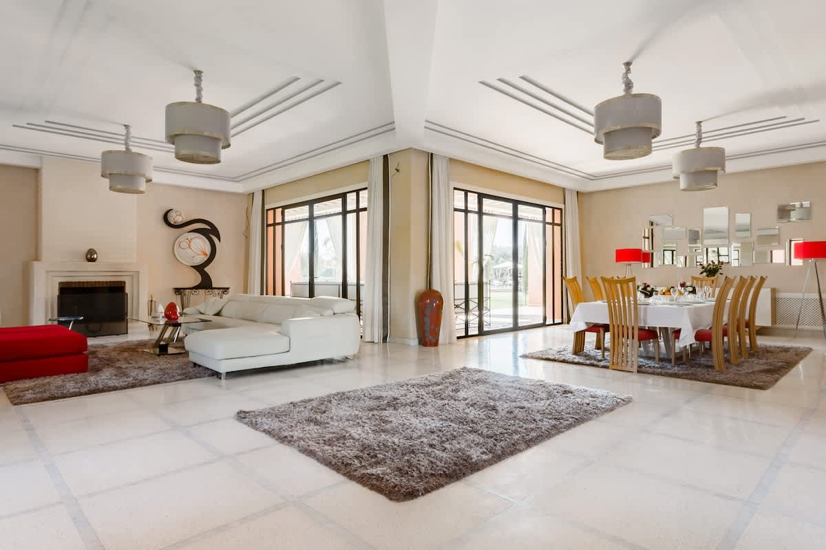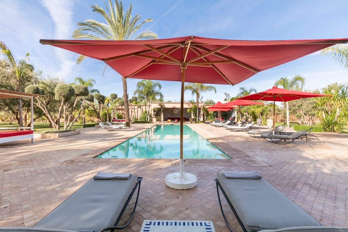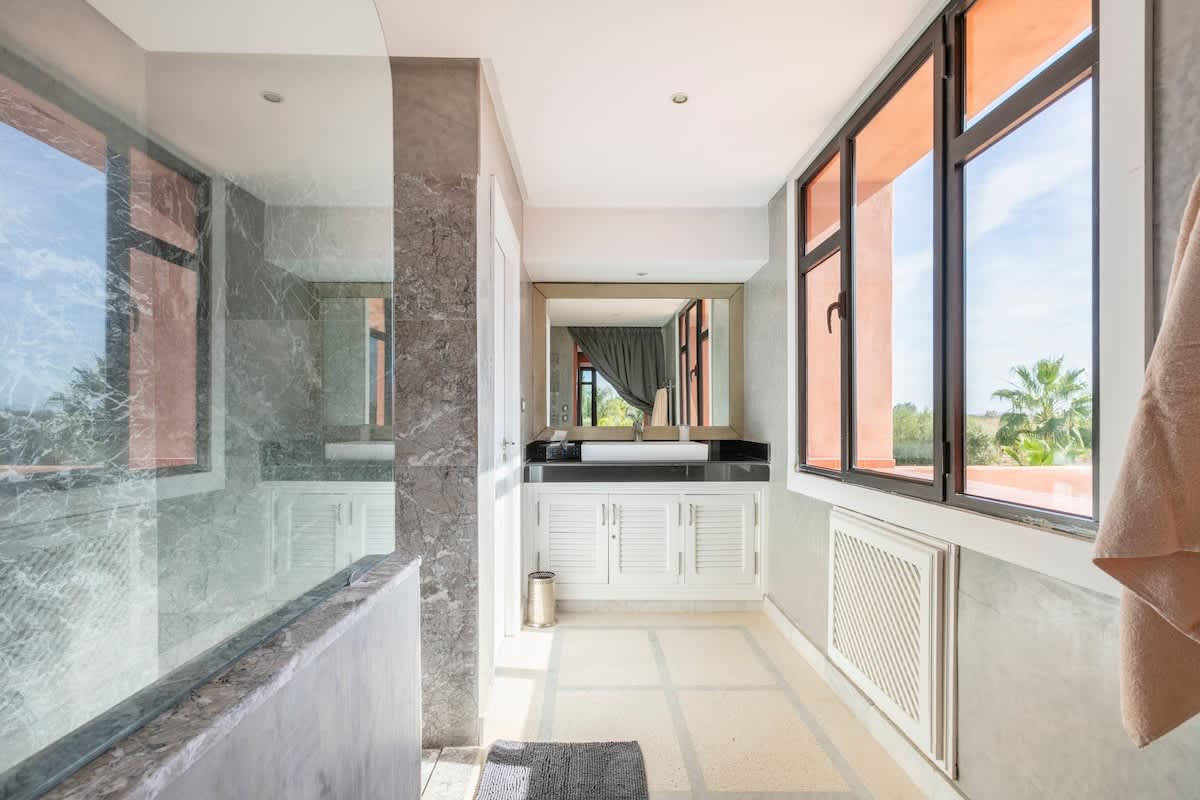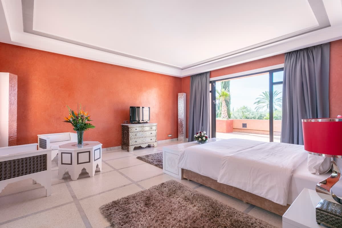 Détendez vous sur la terrasse avec une vue magnifique sur l'Atlas. Spacieuse, avec sa salle à manger, ses deux salons baignés de lumière, ses 5 suites avec salles de bains et vue sur le jardin avec sa piscine de 18m.