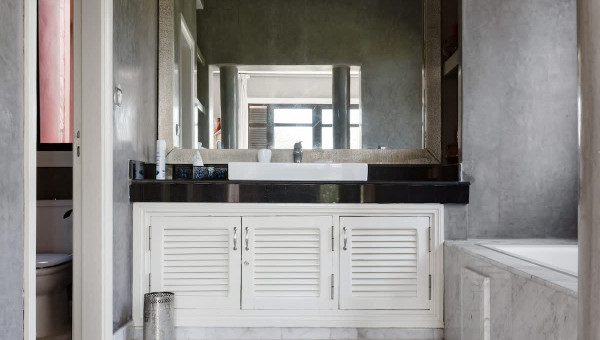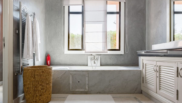 La villa comprend cinq grandes chambres, toutes avec salles de bains attenantes et accès encadré par deux colonnes, ajoutant une touche de grandeur.