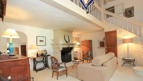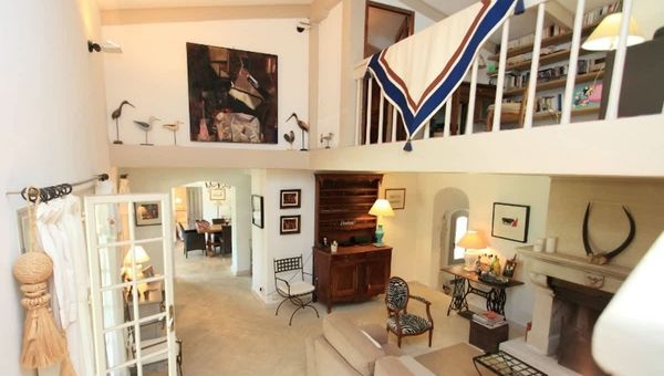 L’entrée donne sur un salon avec mezzanine, une salle à manger et une cuisine équipée : four, cuisinière mixte, frigo, lave-vaisselle et lave-linge.