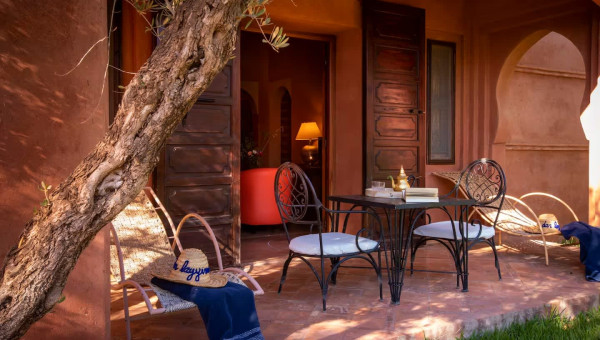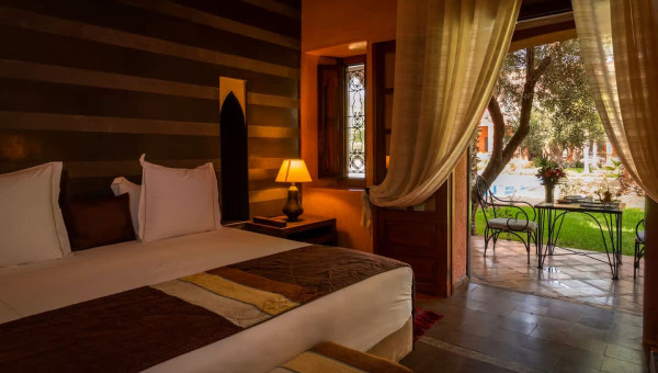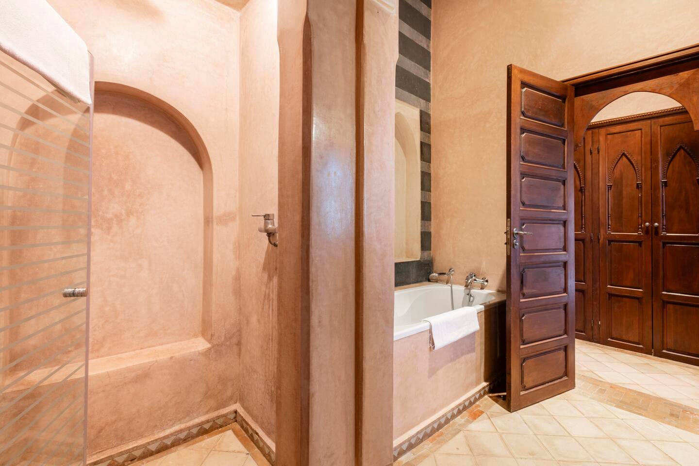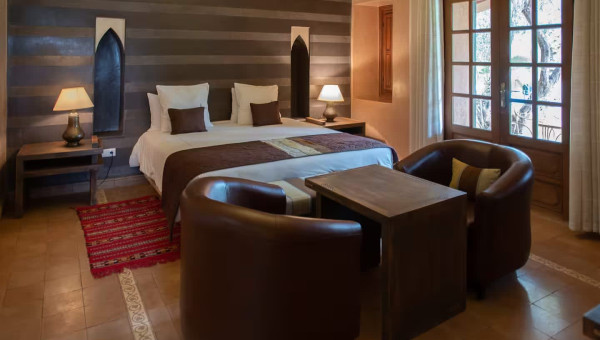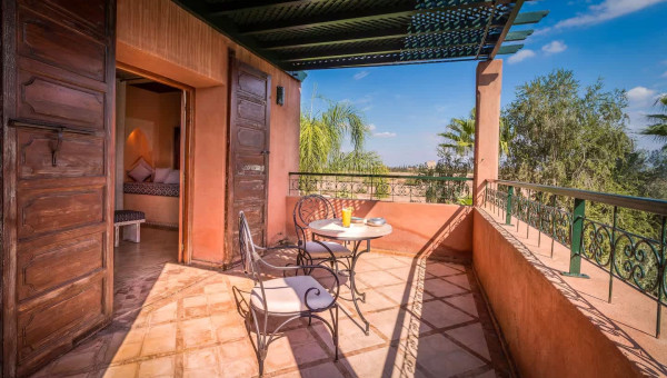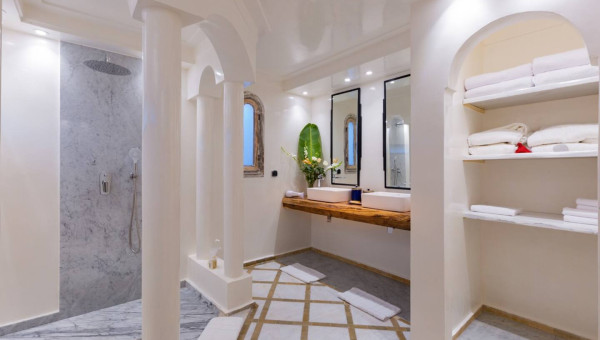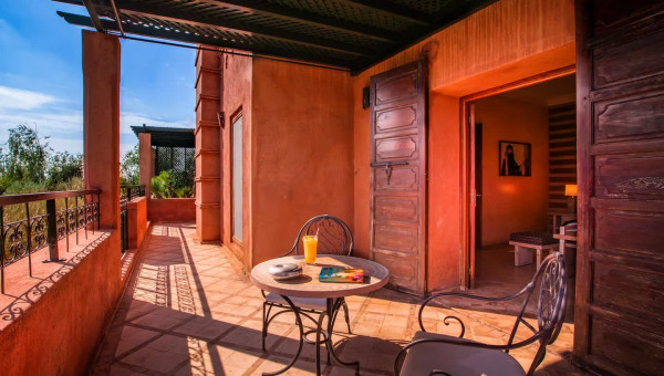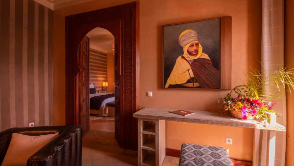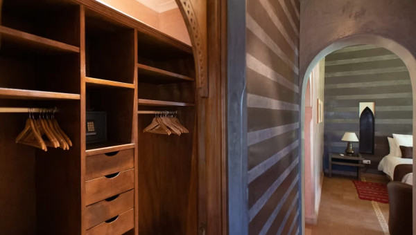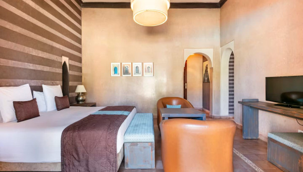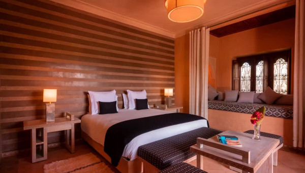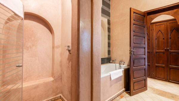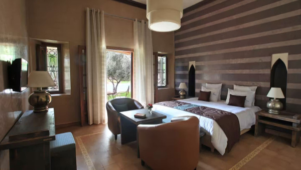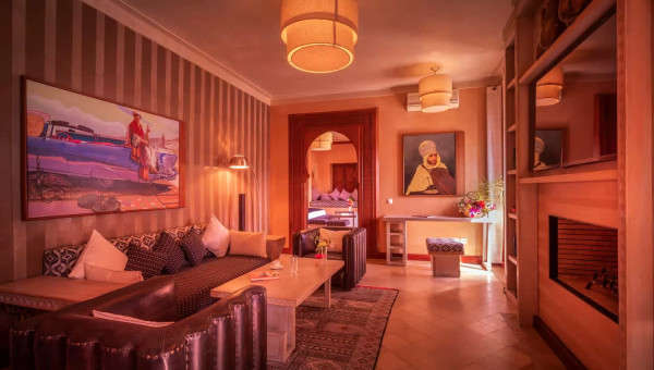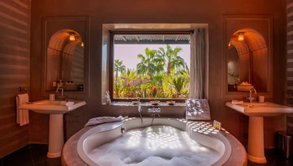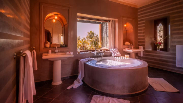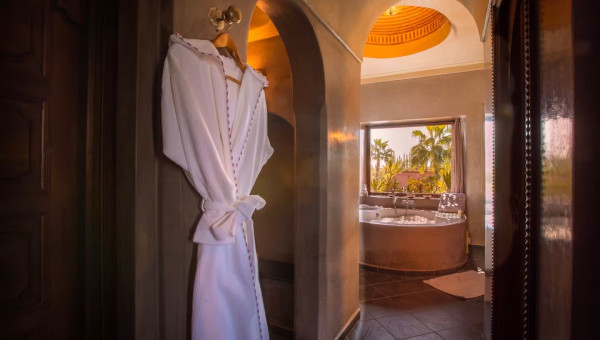 - Suite royale exceptionnelle (111 m²) : lit super king-size, salon cheminée, bibliothèque, home cinéma, dressing, salle de bain avec baignoire, jacuzzi, douche, double vasques, WC indépendant et terrasse privée avec vue sur l’Atlas