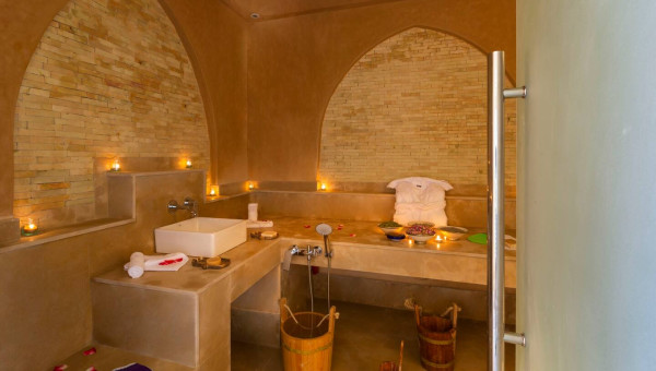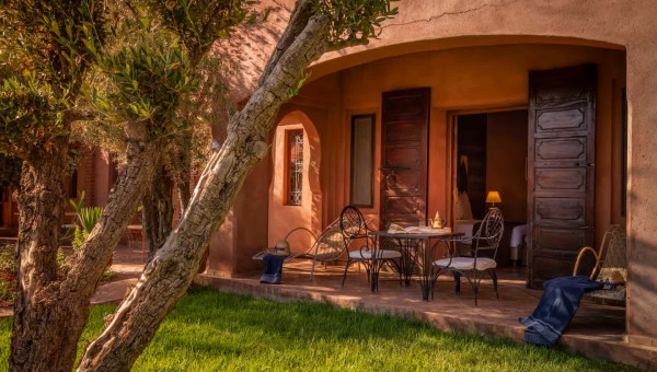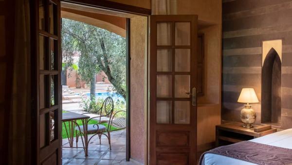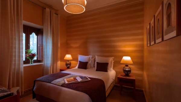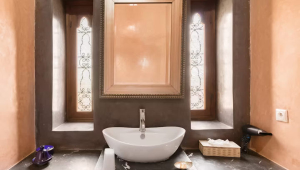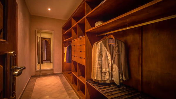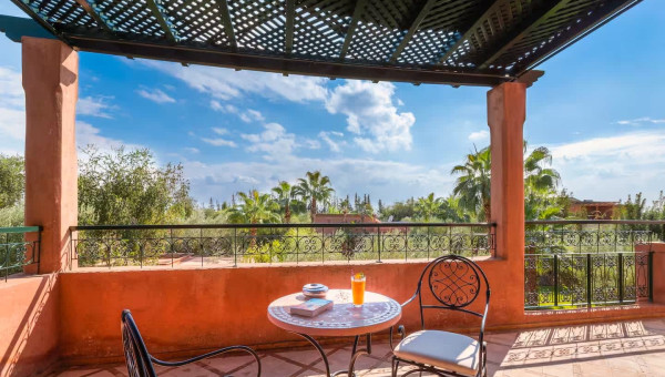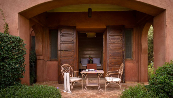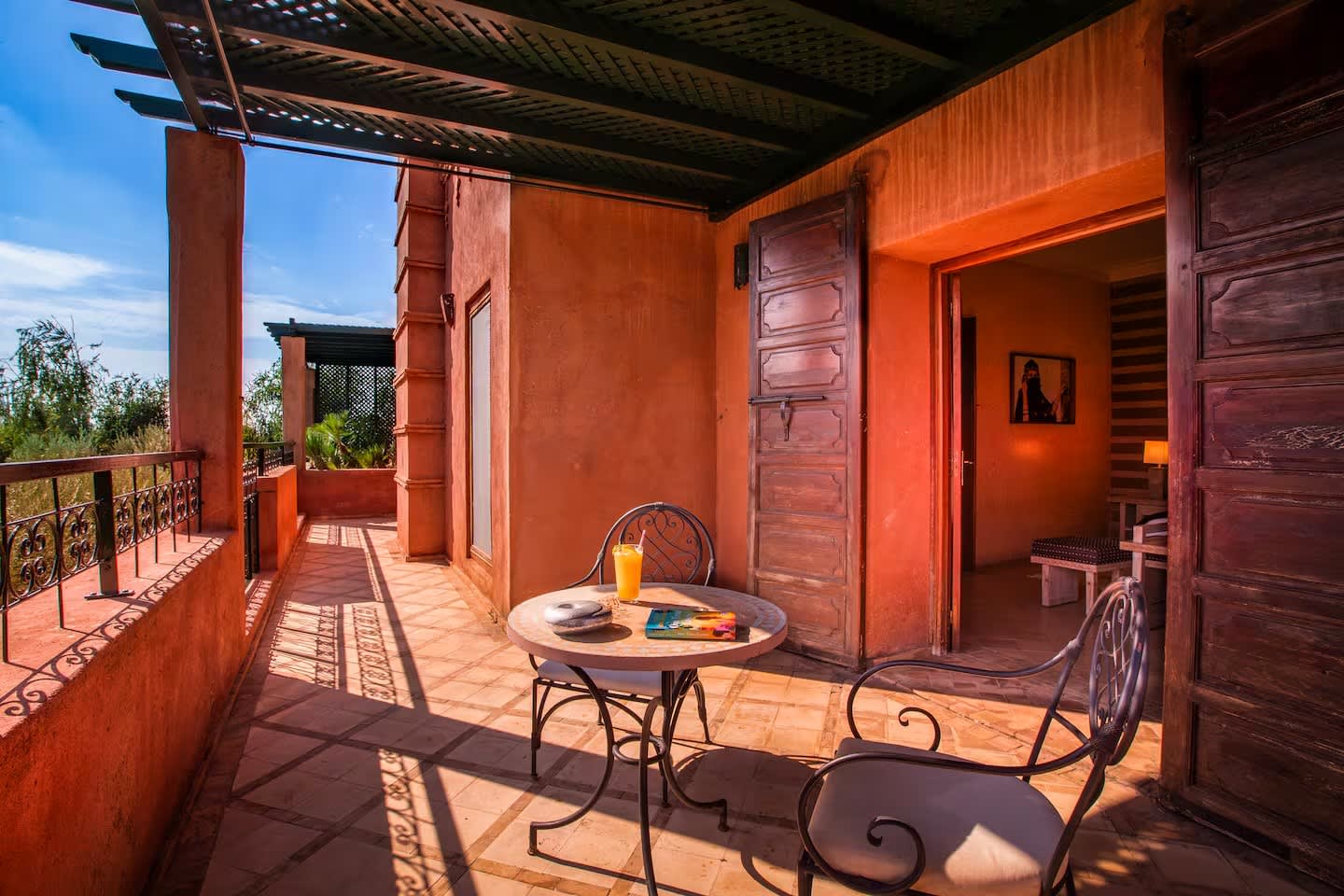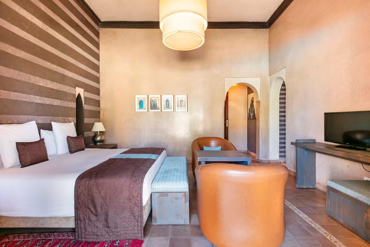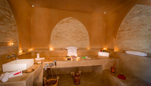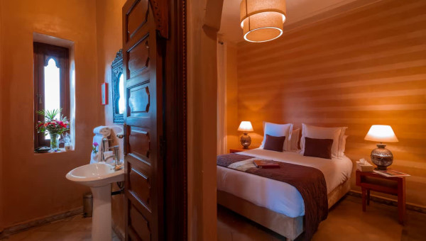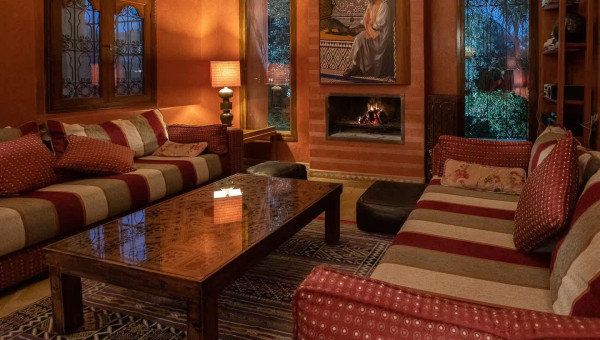 - Suite royale exceptionnelle (111 m²) : lit super king-size, salon cheminée, bibliothèque, home cinéma, dressing, salle de bain avec baignoire, jacuzzi, douche, double vasques, WC indépendant et terrasse privée avec vue sur l’Atlas