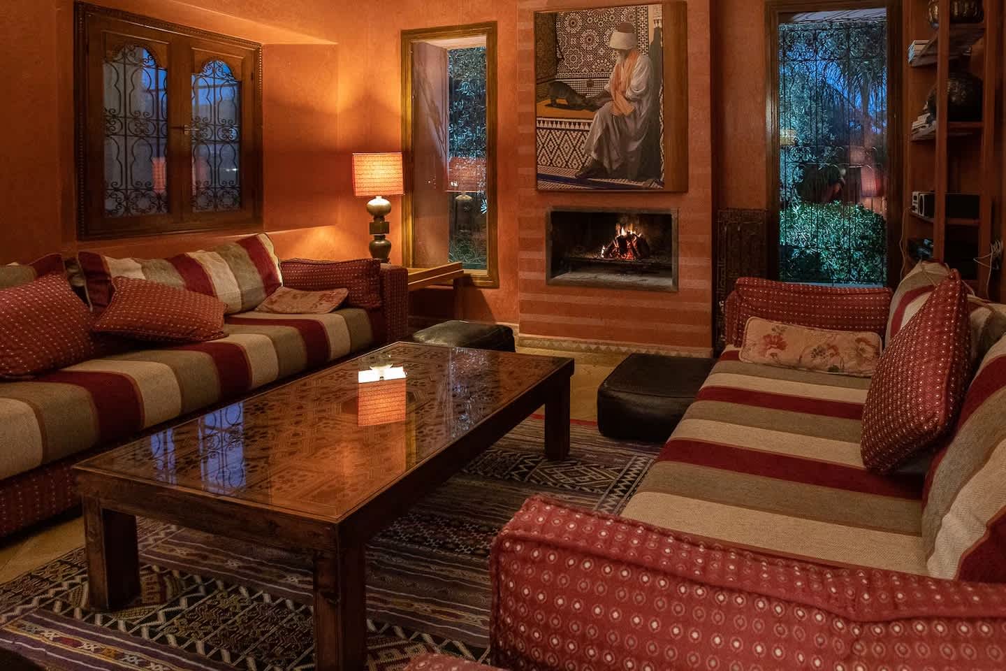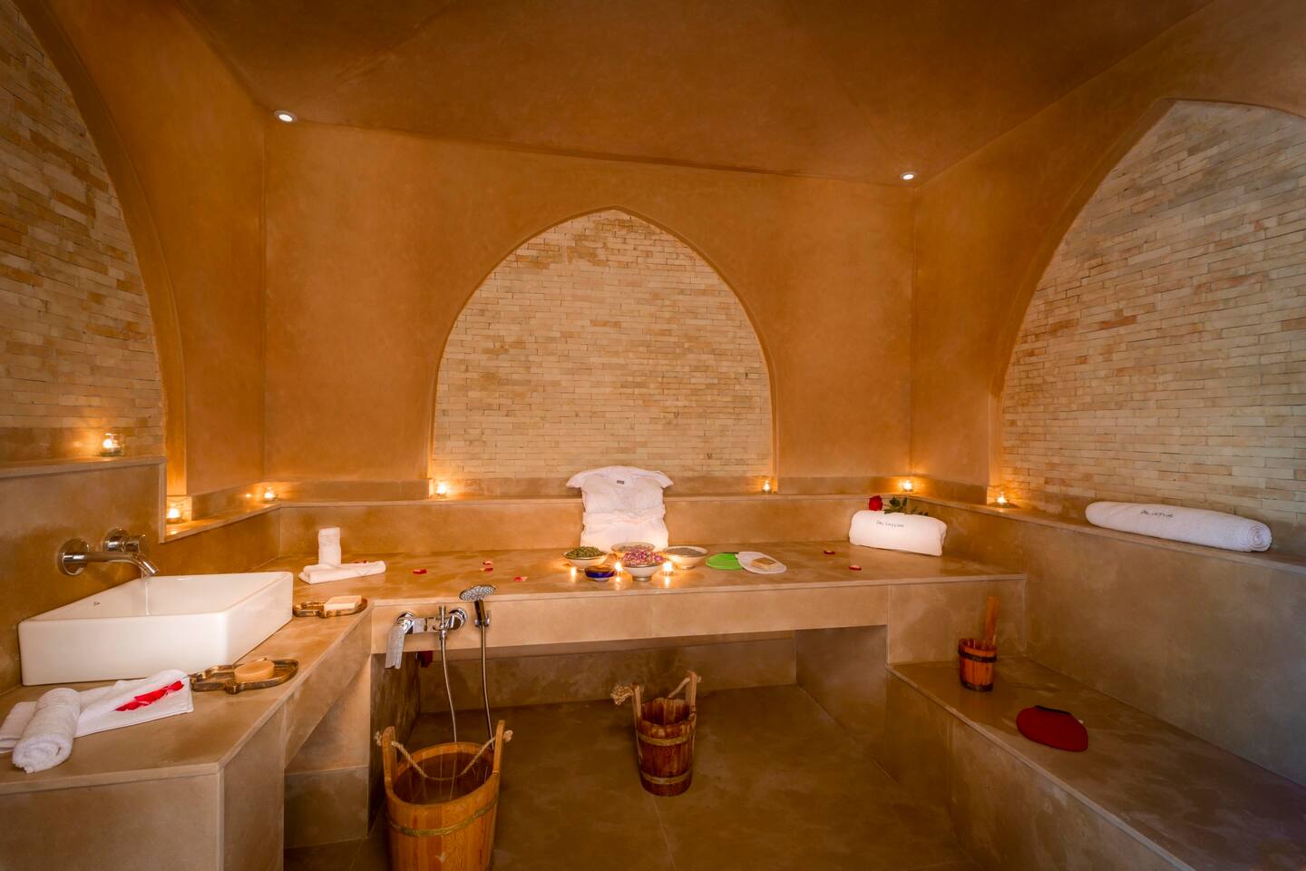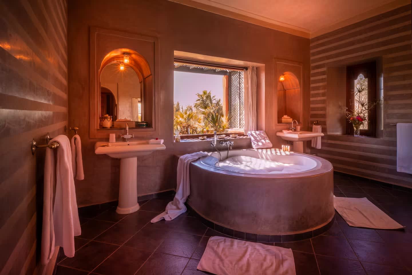 - Suite royale exceptionnelle (111 m²) : lit super king-size, salon cheminée, bibliothèque, home cinéma, dressing, salle de bain avec baignoire, jacuzzi, douche, double vasques, WC indépendant et terrasse privée avec vue sur l’Atlas