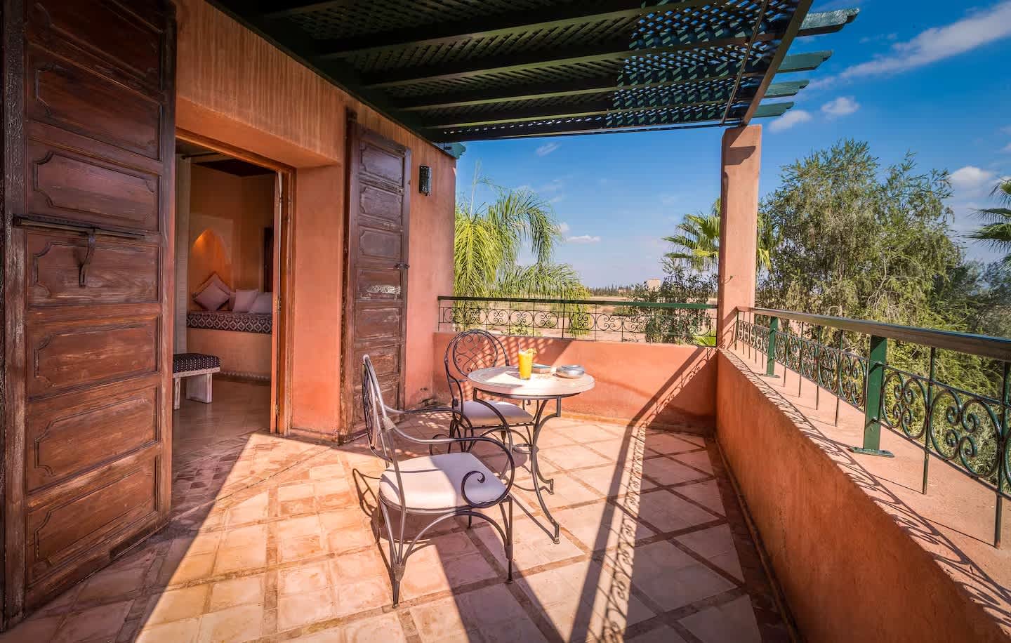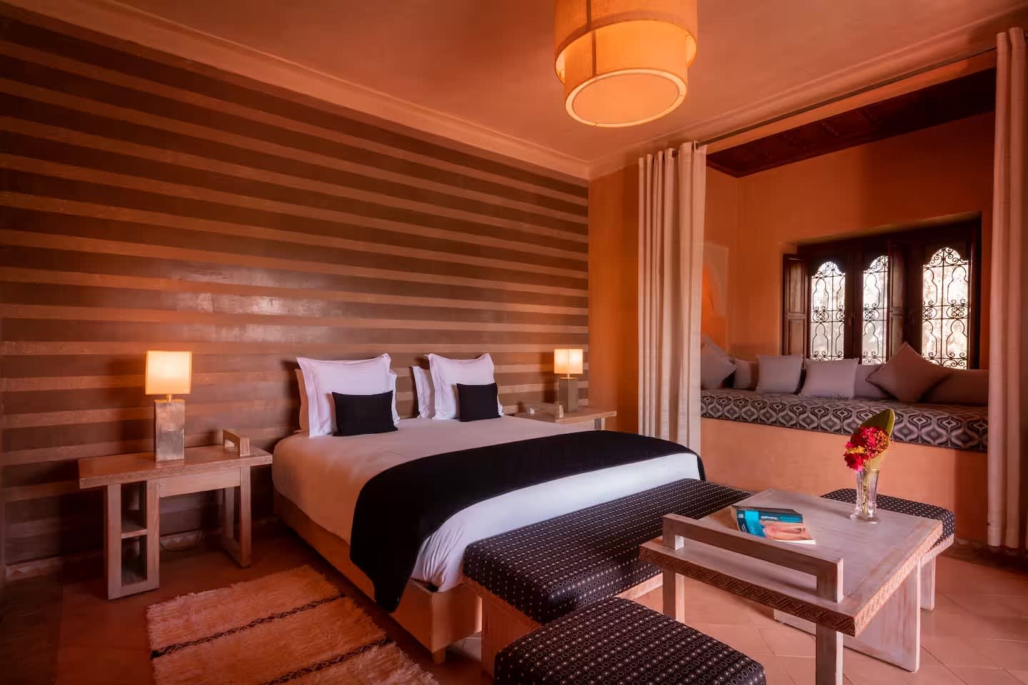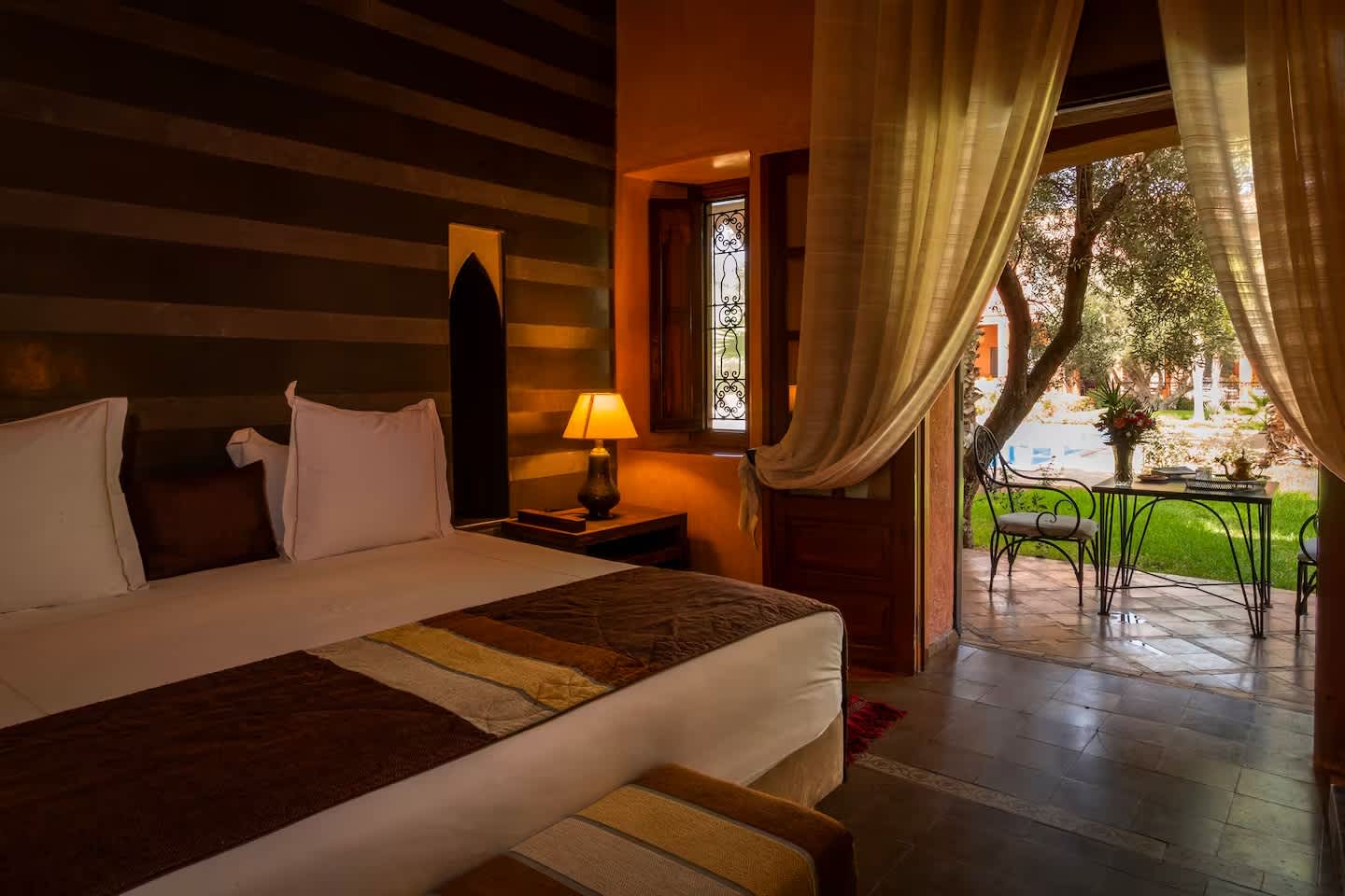 - Suite royale exceptionnelle (111 m²) : lit super king-size, salon cheminée, bibliothèque, home cinéma, dressing, salle de bain avec baignoire, jacuzzi, douche, double vasques, WC indépendant et terrasse privée avec vue sur l’Atlas