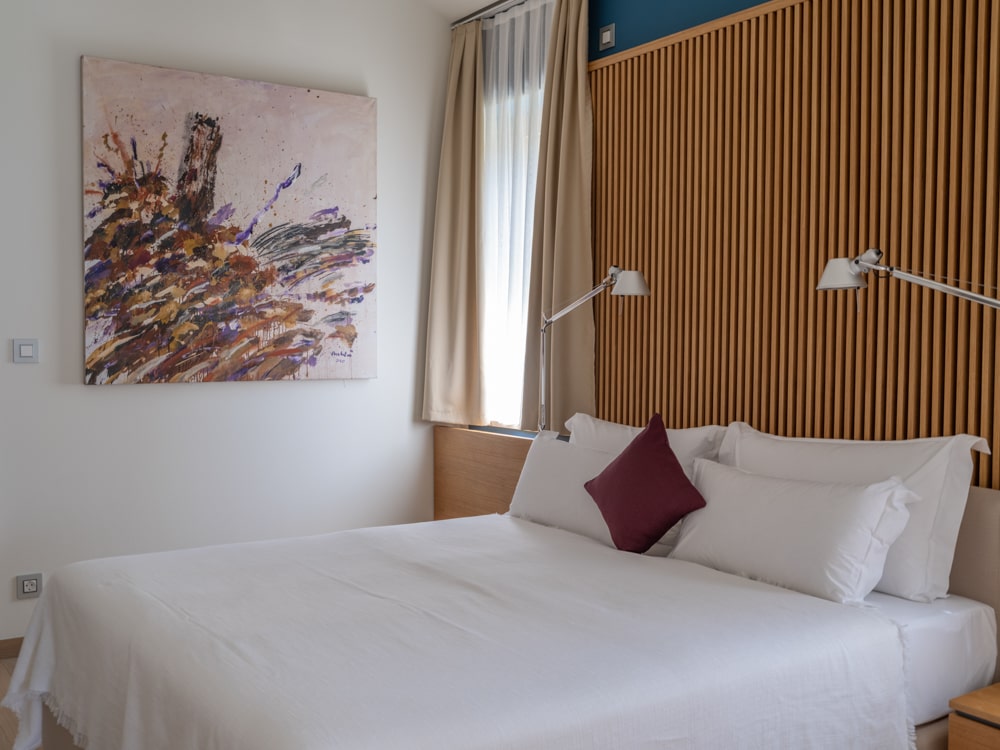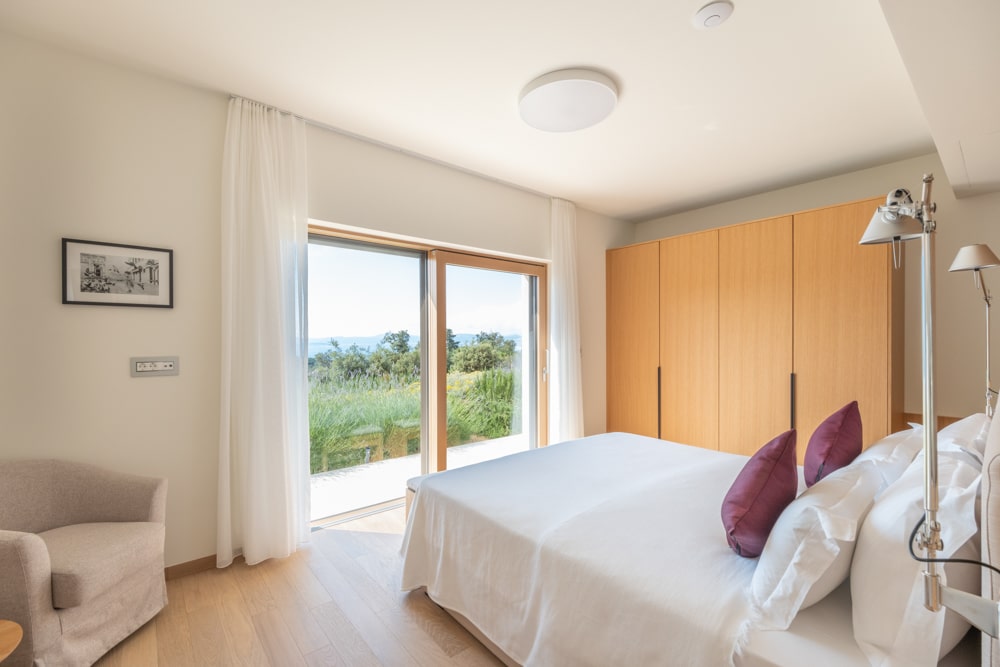 Chambres 4 et 5 : 22 m² chacune, identiques et situées de part et d’autre de la maison. Lits King-Size convertibles en lits jumeaux. Dressings. Vue sur le jardin depuis les fenêtres et vue sur la mer depuis les terrasses.