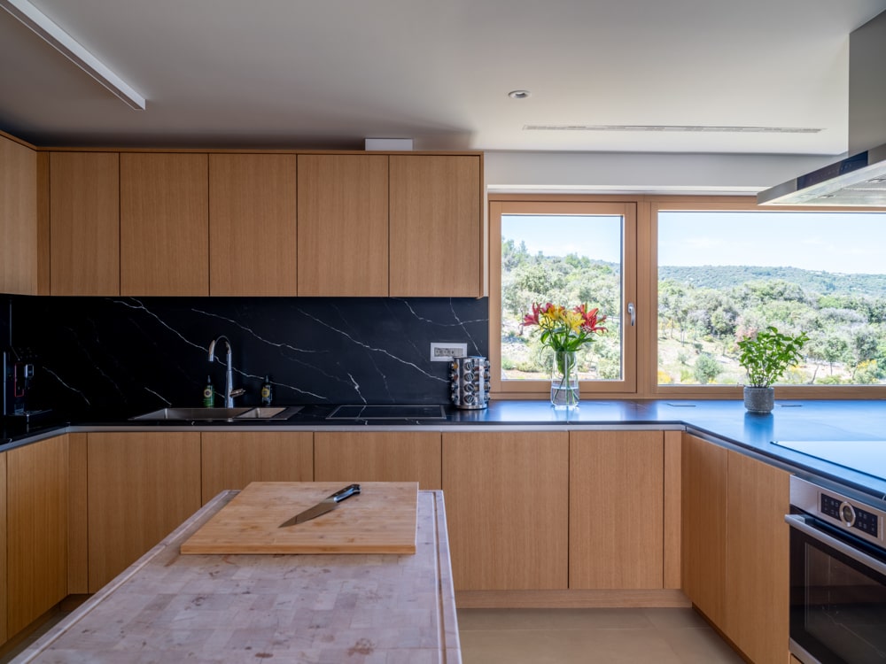 Cuisine d’Été pour dîners en Plein Air : 76 m², ombragée, extensible jusqu’à 24 personnes, avec bar, réfrigérateur, grill professionnel (3 sections) et four à pizza partagé avec la villa adjacente.