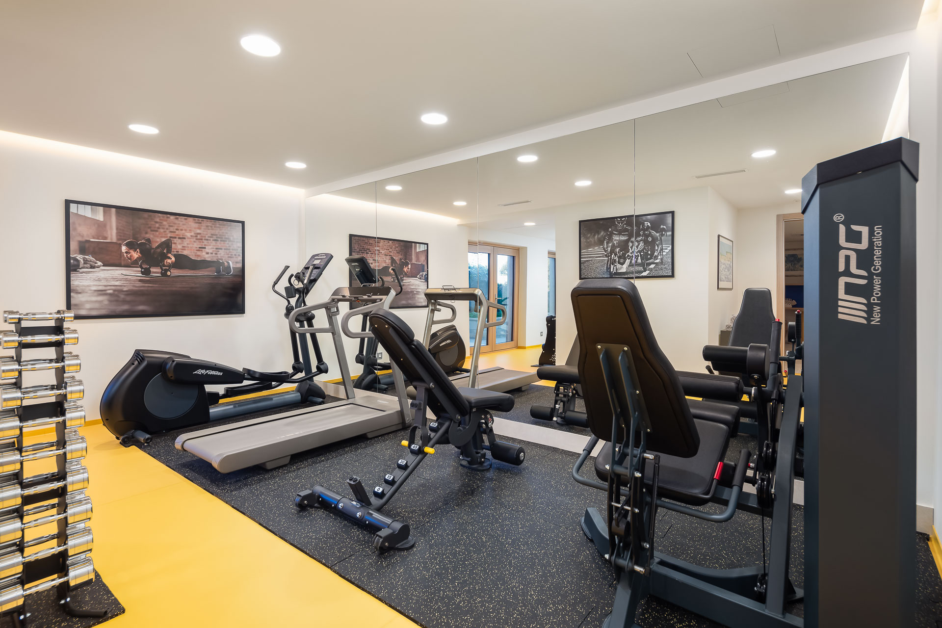 Salle de Gym : 30 m², vue et accès à la cour, équipée de divers appareils et poids libres.