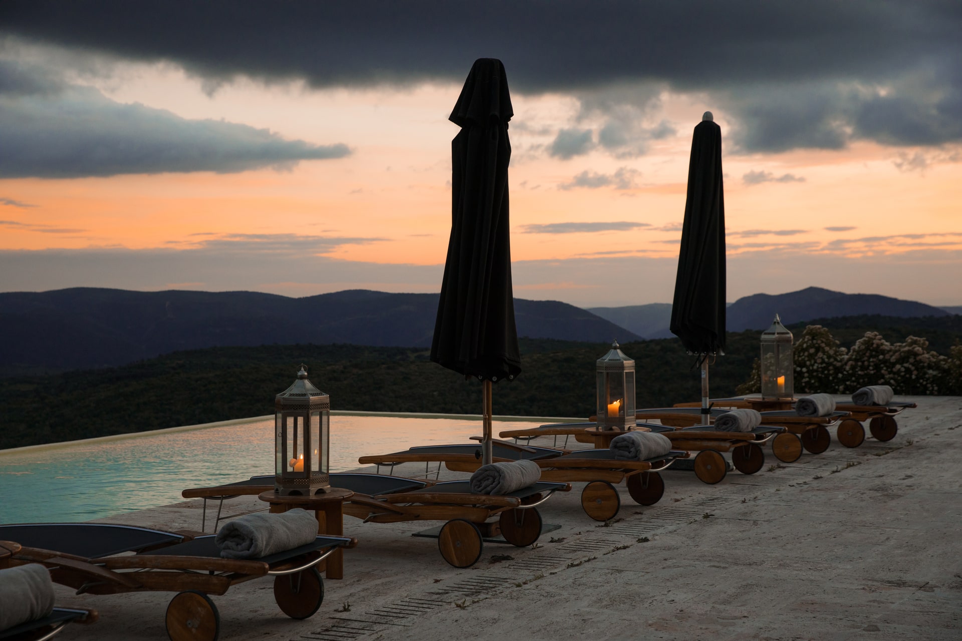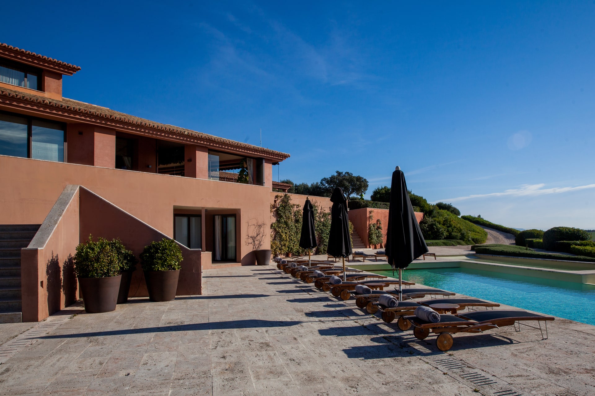À l’extérieur, deux piscines à débordement (adultes et enfants), un spa complet (sauna, hammam, 2 salles de soins), un court de tennis, un centre équestre et une salle de gym invitent à la détente et aux loisirs. L’héliport et la piste d’atterrissage privée garantissent un accès exclusif au domaine.