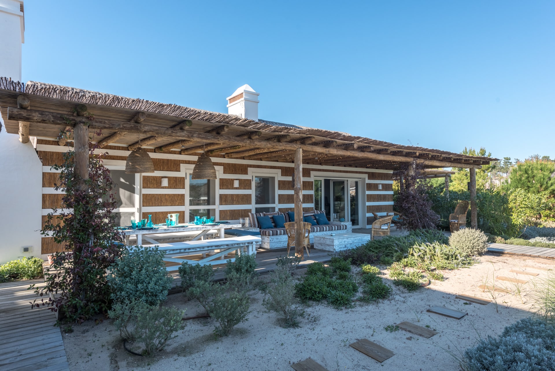 La villa de luxe Pepito, située dans un cadre unique à Comporta, au Portugal, avec son toit de pailles, ses rayures blanches et ses pergolas en bois, la villa Pepito a des airs de cabane de pêcheur cosy. Conçues pour accueillir, jusqu’à 8 personnes, cette villa de 200 m² propose un espace généreux pour un séjour inoubliable. Cette villa offre le confort à chaque invité avec ses 4 chambres luxueuses et ses 4 salles de bain confort.