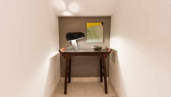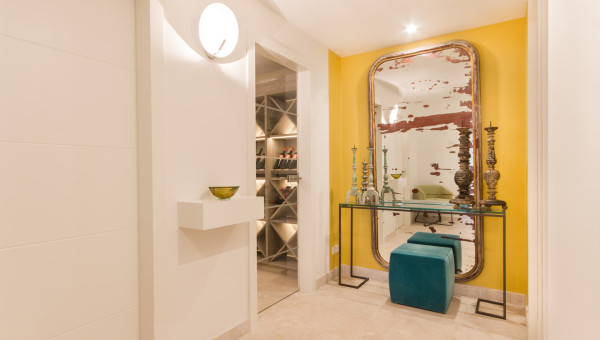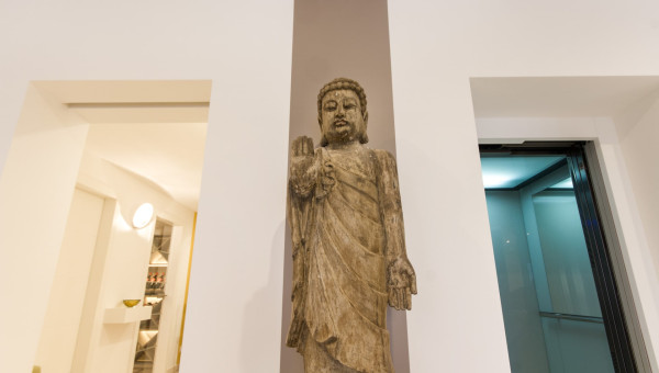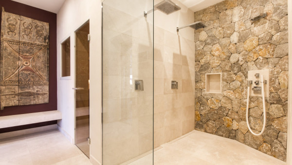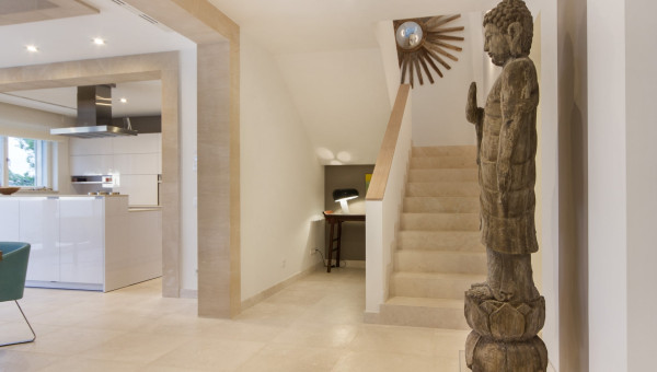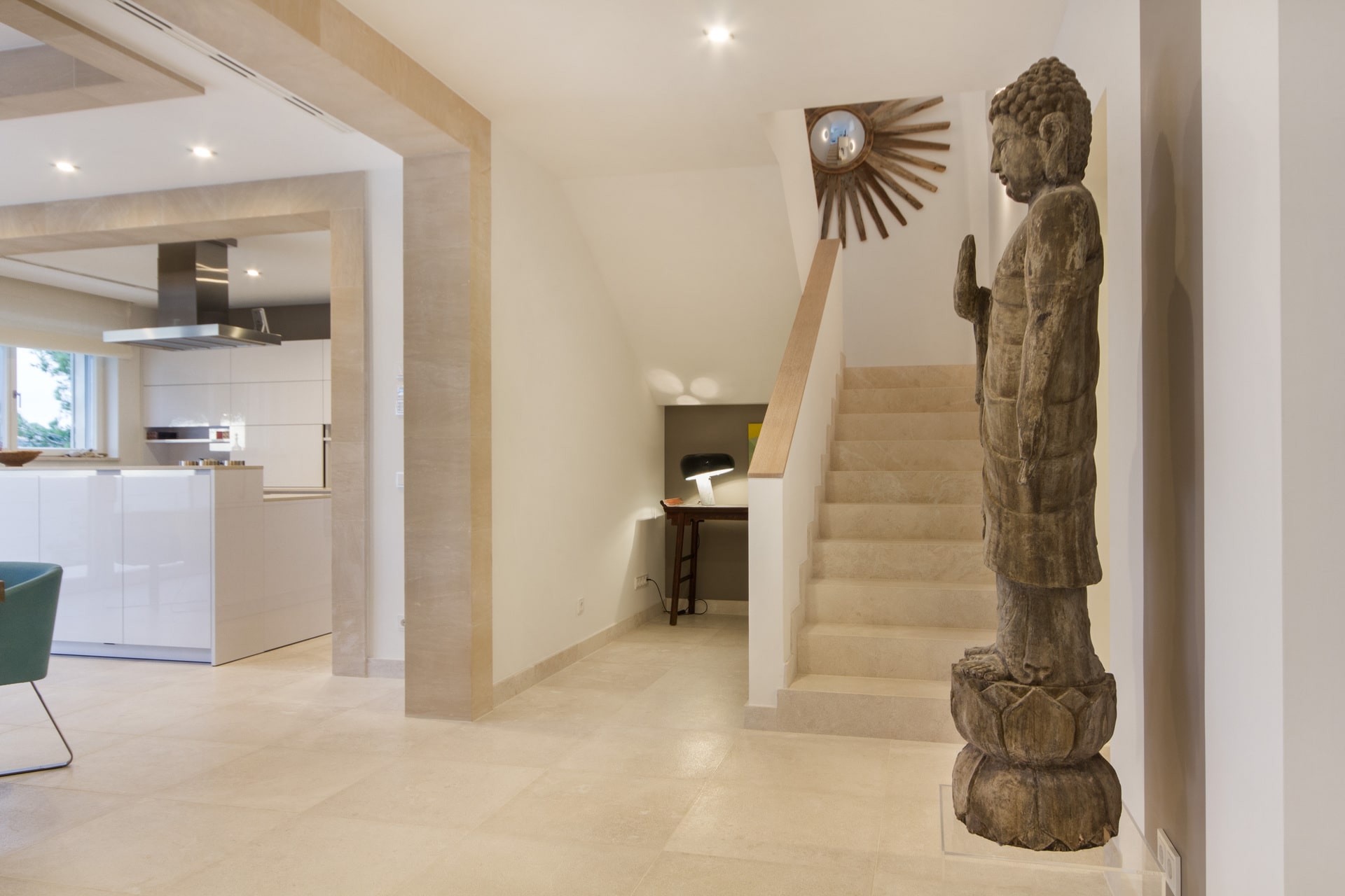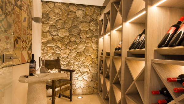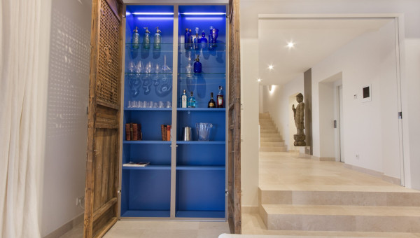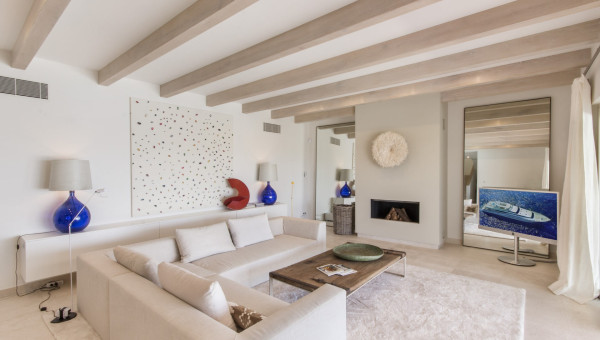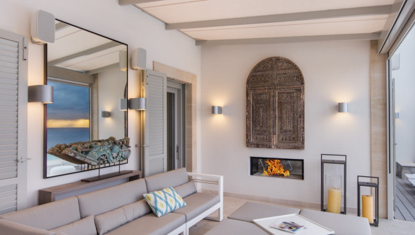À l’intérieur, la décoration contemporaine s’inspire du style bord de mer. Des canapés couleur sable, des fauteuils bleu azur ou turquoise, du bois flotté et des coquillages créent une ambiance douce et naturelle dans chaque coin de la villa, du salon à la salle à manger.